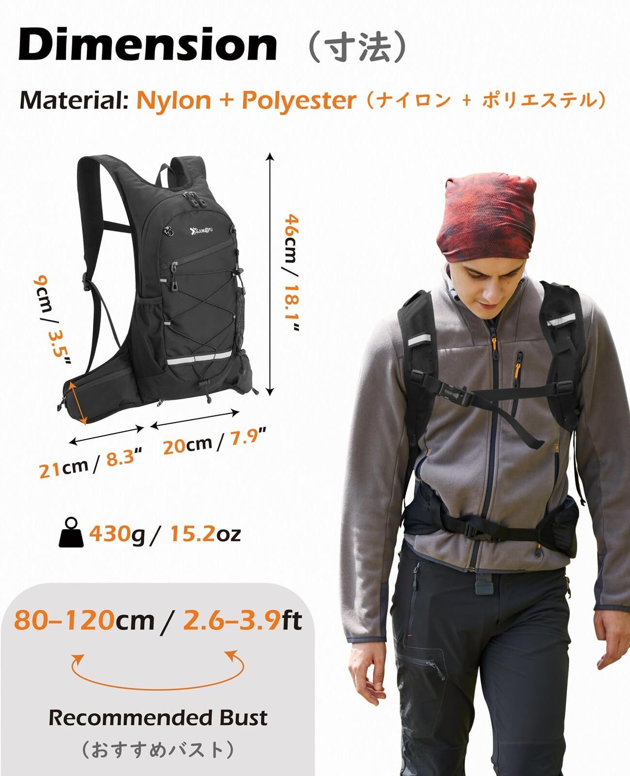 【軽量&フィット感】約430gの軽量設計で、走っても揺れにくい密着フィット。ショルダーとチェストベルトは調節可能で、体型や荷物に合わせて快適な装着感に調整可能。通勤ランや里山登山など、長時間の使用でも快適なトレッキングリュックをお探しの方におすすめです