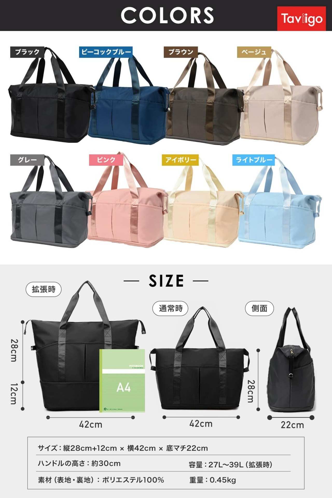 【商品詳細】本体サイズ:横42×高さ28+ 12cm×マチ22cm、ハンドルの長さ約30cm。素材:ポリエステル100%。容量:27L~39L(拡張時)。重量:450g。カラー:ブラック、ピーコックブルー、ブラウン、グレー、ベージュ、ピンク、ライトブルー、アイボリー