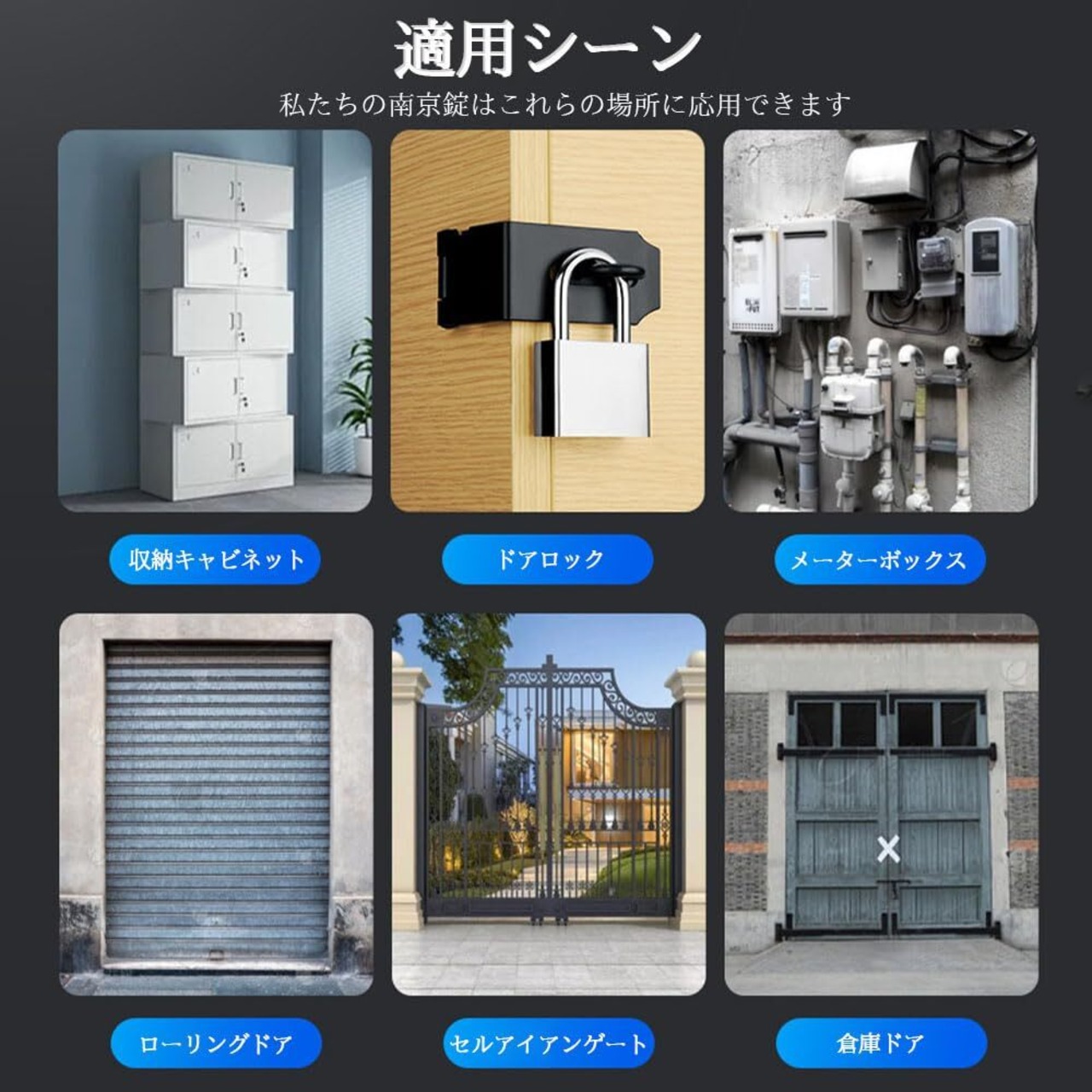 3.パッケージ内容:掛錠2個、鍵8本、本体寸法:30×65mm(幅×高さ)、ロックピン直径:4.8mm、ロックピン内側寸法:14×37mm(幅×高さ)、色:シルバー、材質:鉄。