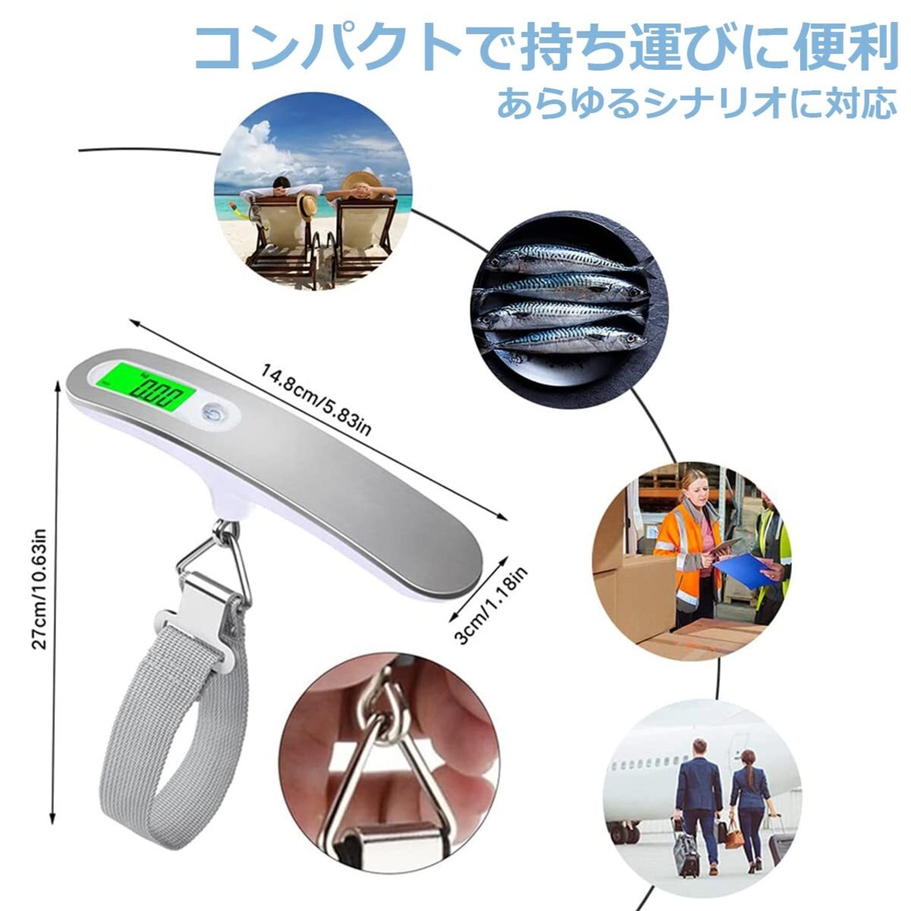 [コンパクトで持ち運びに便利なフック付き]150×30×55mm、重さ83g(電池含む)のデジタルラゲッジスケールです。) 軽量で持ち運びに便利なラゲッジスケールは、バッグに入れて持ち運ぶことができ、場所を取らないので、家庭用、物流会社、頻繁に旅行される方などに最適です。