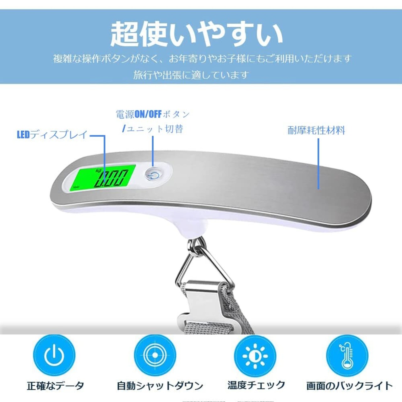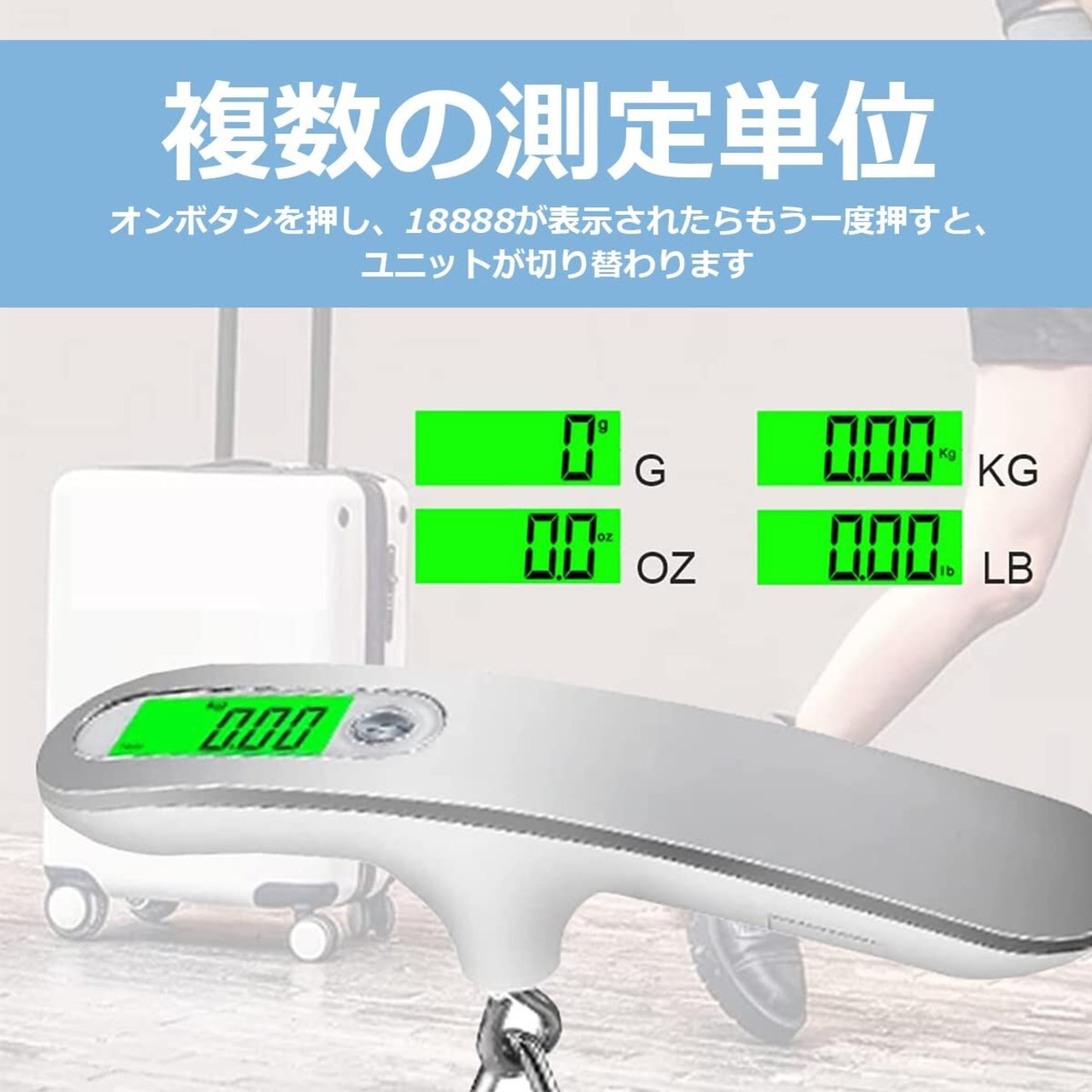 [多機能ラゲッジスケール]ポータブルデジタルラゲッジスケールは、4つの重量単位に加え、風袋引き機能、ローバッテリーメッセージ、オーバーロードメッセージ、オートシャットオフ機能を備え、時間と手間を省き、耐久性を向上させる。