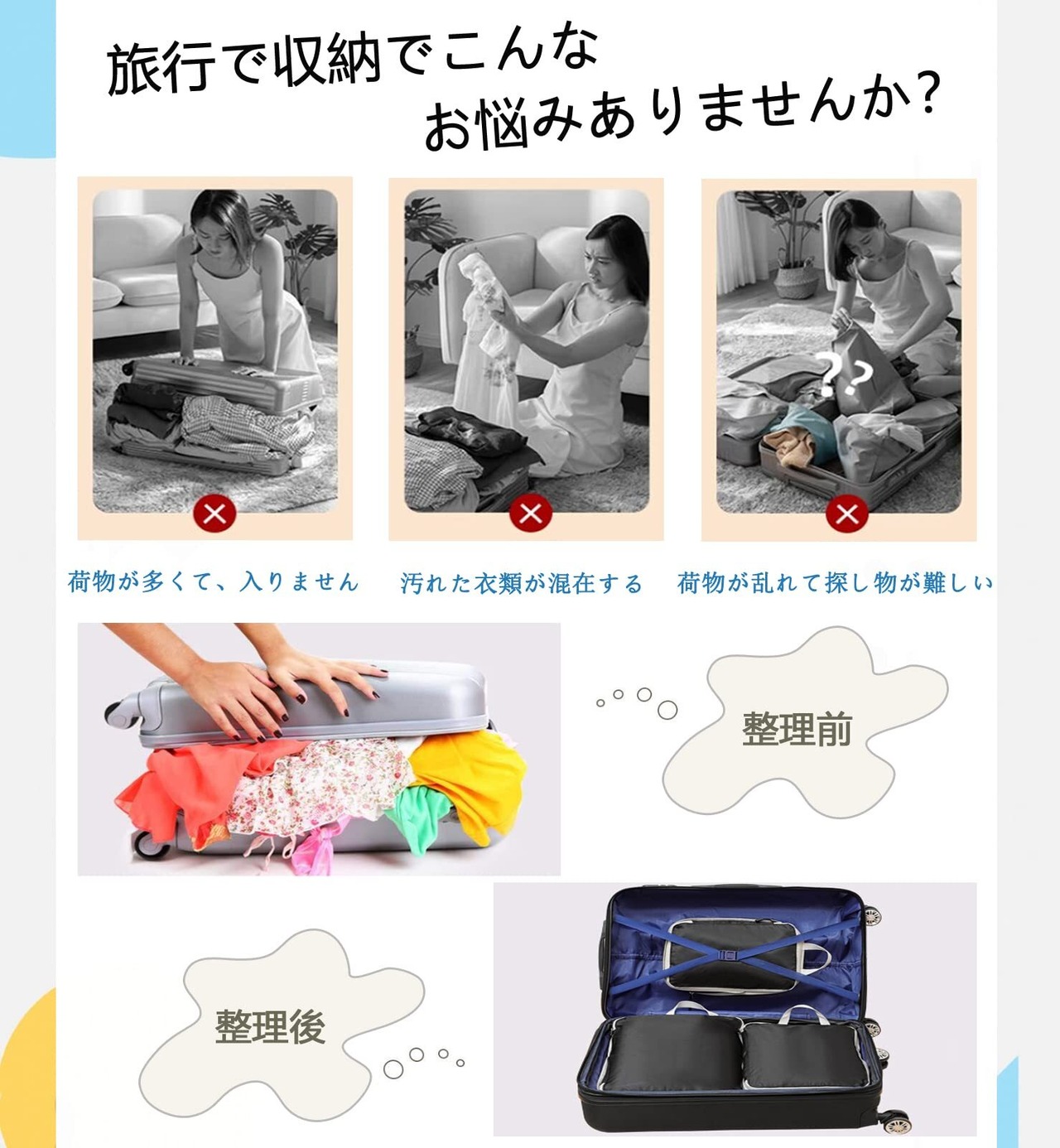 【簡単圧縮・スペース節約】ジッパーを使用して簡単圧縮。この製品はファスナーにを閉めるだけでOKの圧縮機能ですので 圧縮用の吸引機の圧縮効果はありません。圧縮バッグに衣類を入れた後、圧縮ジッパーを閉めてスーツケース内のスペースを約50%省くことができます。高品質ジッパーを使用して、ファスナー壊れにくく。ご安心使用してください。見た感じは小さい圧縮バッグですが、実際は多くの衣類が入ります。