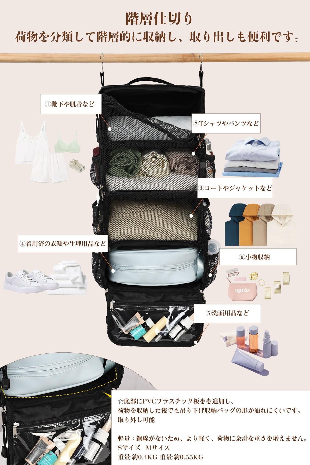 【吊下げタイプ】吊下げタイプなので、壁掛けが可能です。入ることはもちろん、取り出しも持ち運びにも便利です。通気性がいいし、中のものも一目瞭然で、時間を節約、頻繁に出張に行く身としては非常に便利です。