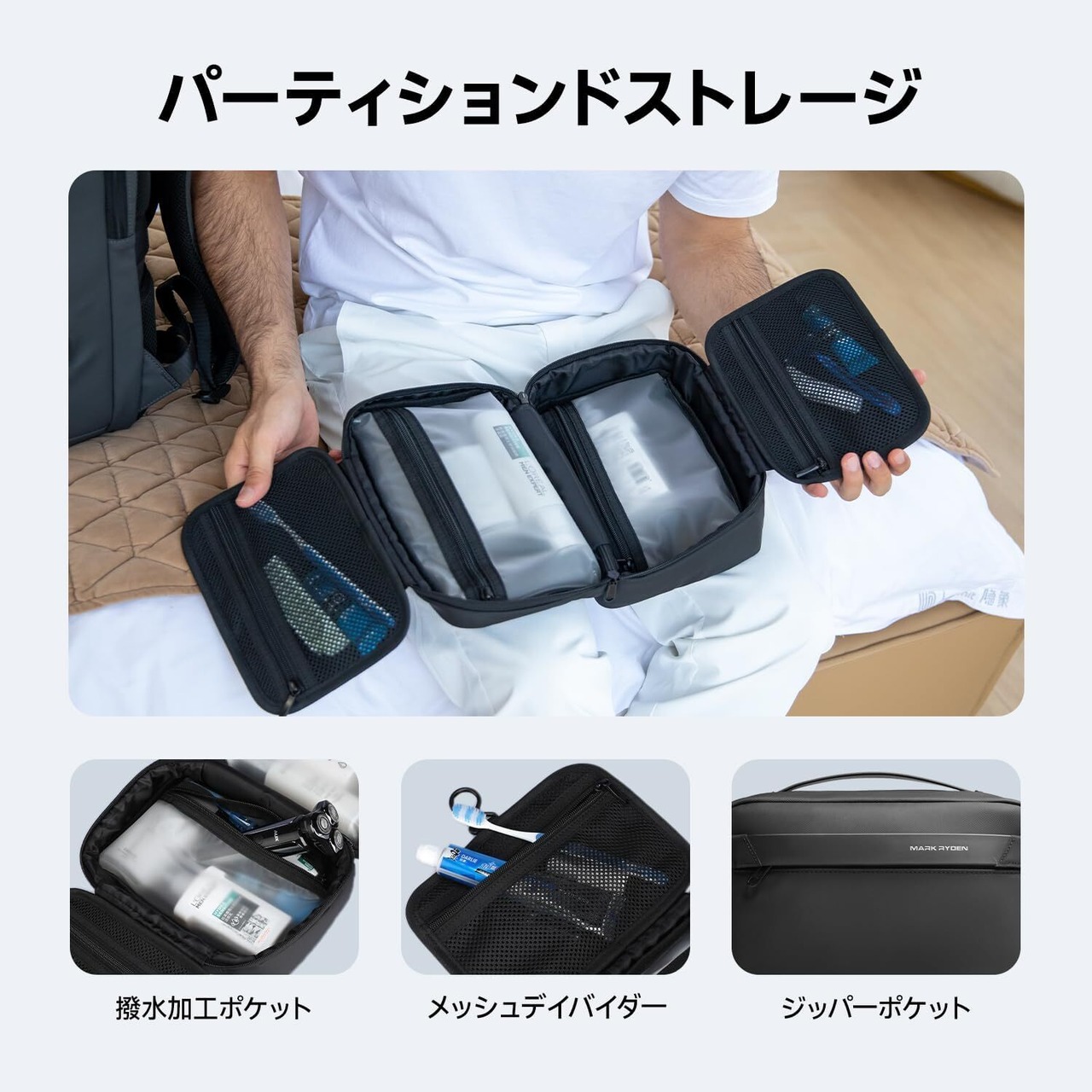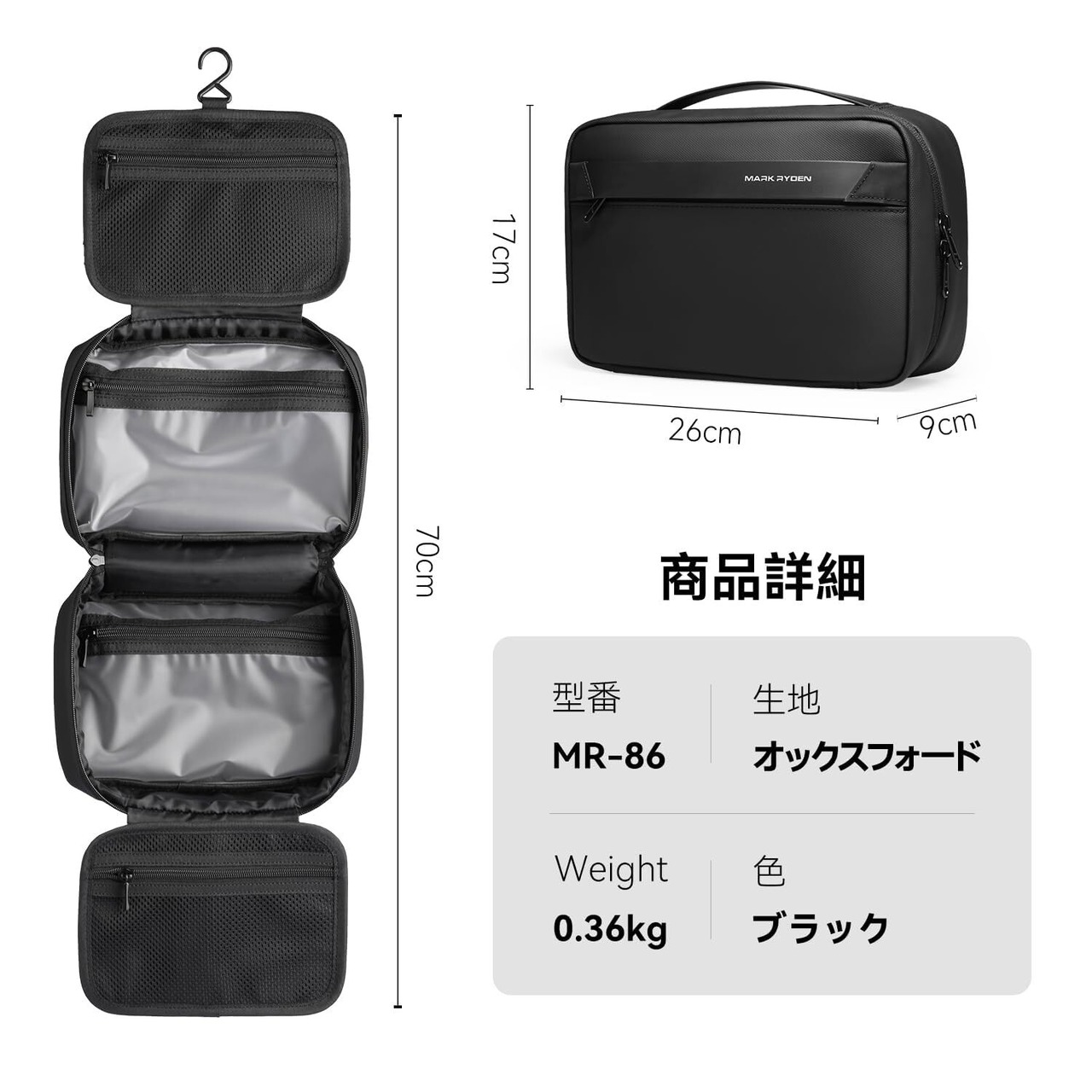 [MARK RYDEN] [マークライデン] トラベルポーチ 吊り下げ メンズ トイレタリーバッグ 乾湿分離 ガジェットポーチ 小物入れ ケース 出張 収納 旅行 便利グッズ(黒)