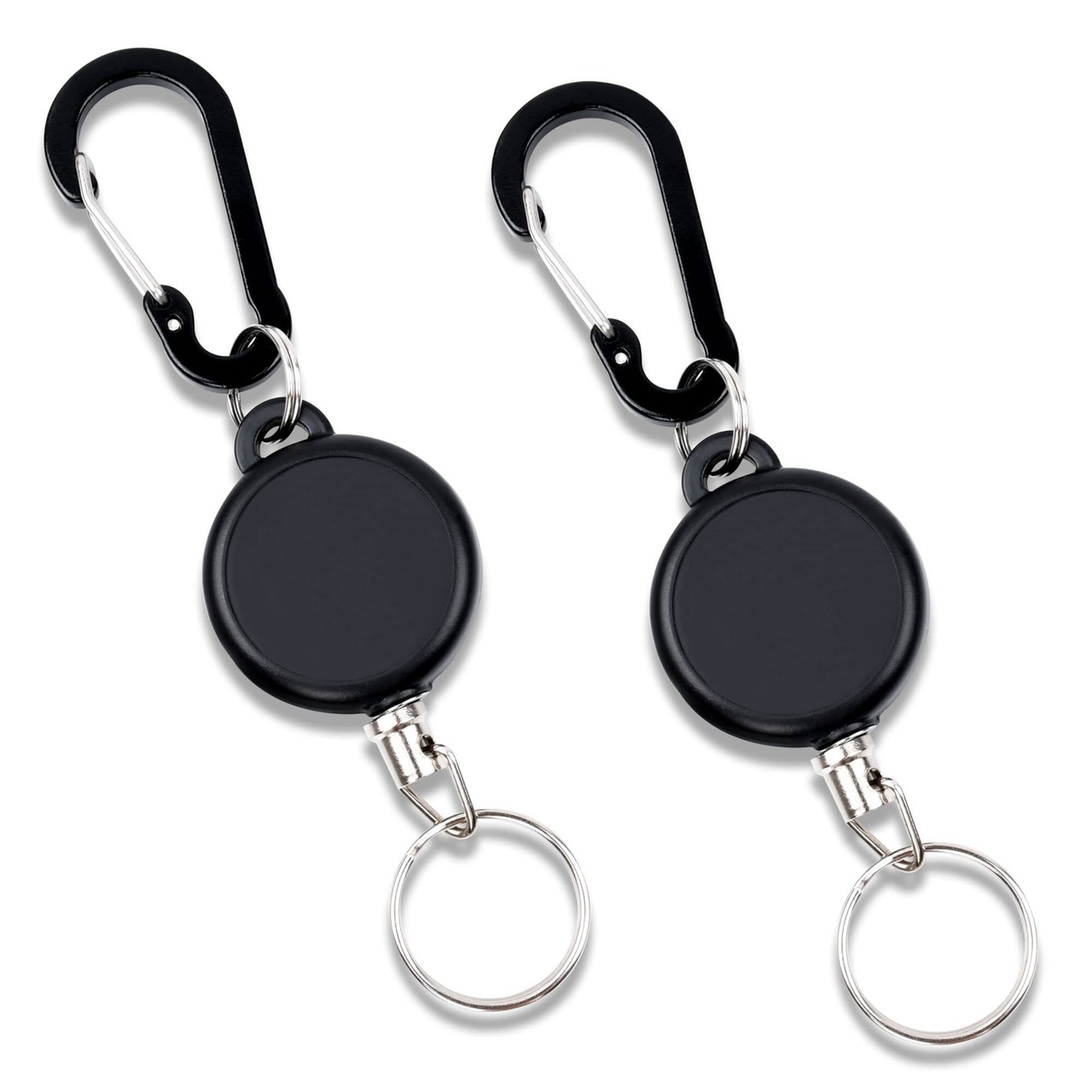 【製品仕様】スチールワイヤーが内蔵されており、摩擦に強く丈夫なリールキーホルダーです。材質:ABS+亜鉛合金。重量:約。携帯性抜群。本体:直径3.5cm、厚み1.2cm。2個セット、予備があるので安心です。