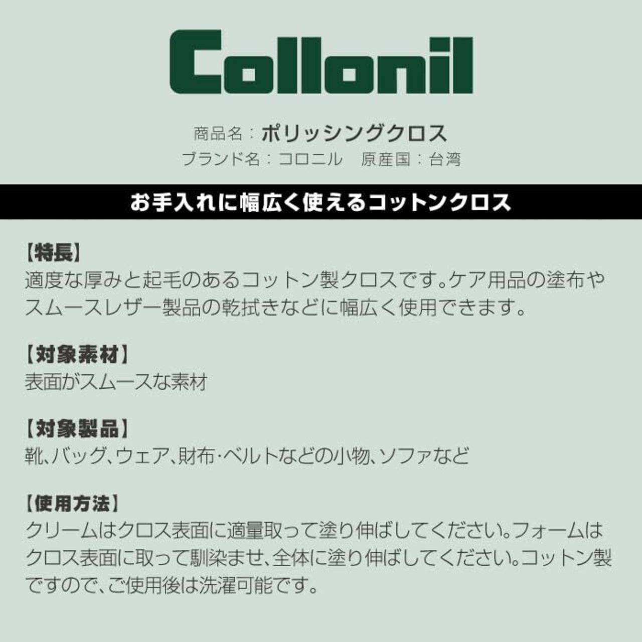 【100年以上の歴史を誇るドイツ発のレザーケアブランド】創業から世界中で愛用され続けるレザーケアのトップブランドCollonilが手掛けるポリッシングクロス。長くものを大切にしたい方に、この業界100年のベテランであるCollonilが信頼できるレザーケアをお届けします。