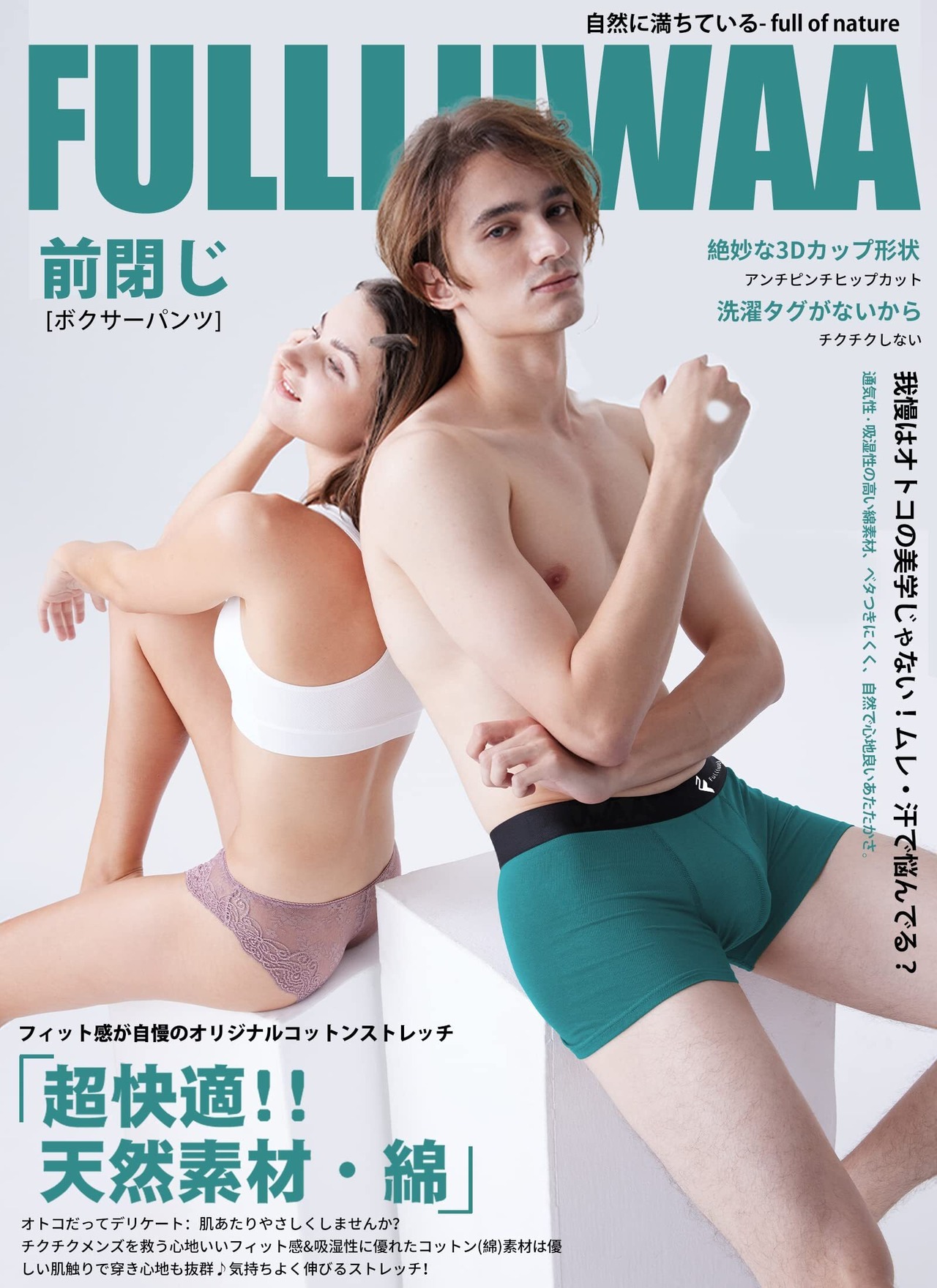 【立体設計】ボクサーパンツのフロント部は前閉じタイプで、押さえつけない立体設計が密着せずに収まりも良く、とても自然でまるで何も履いていないかのようです。大切な部を守るために、2重生地を作ります。