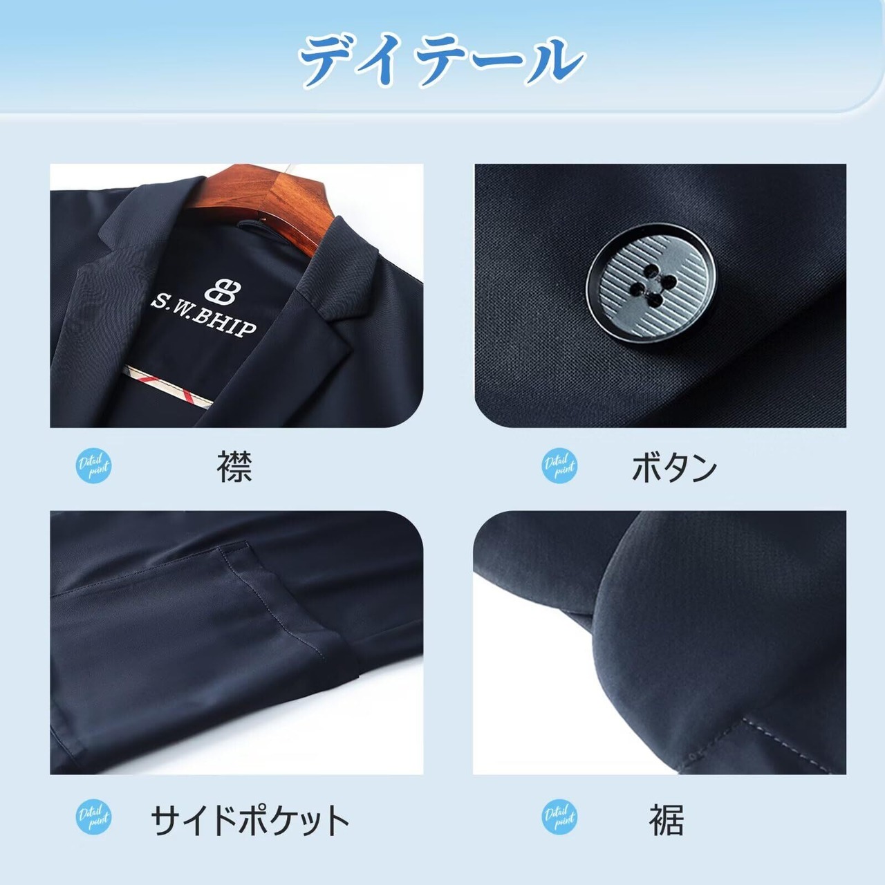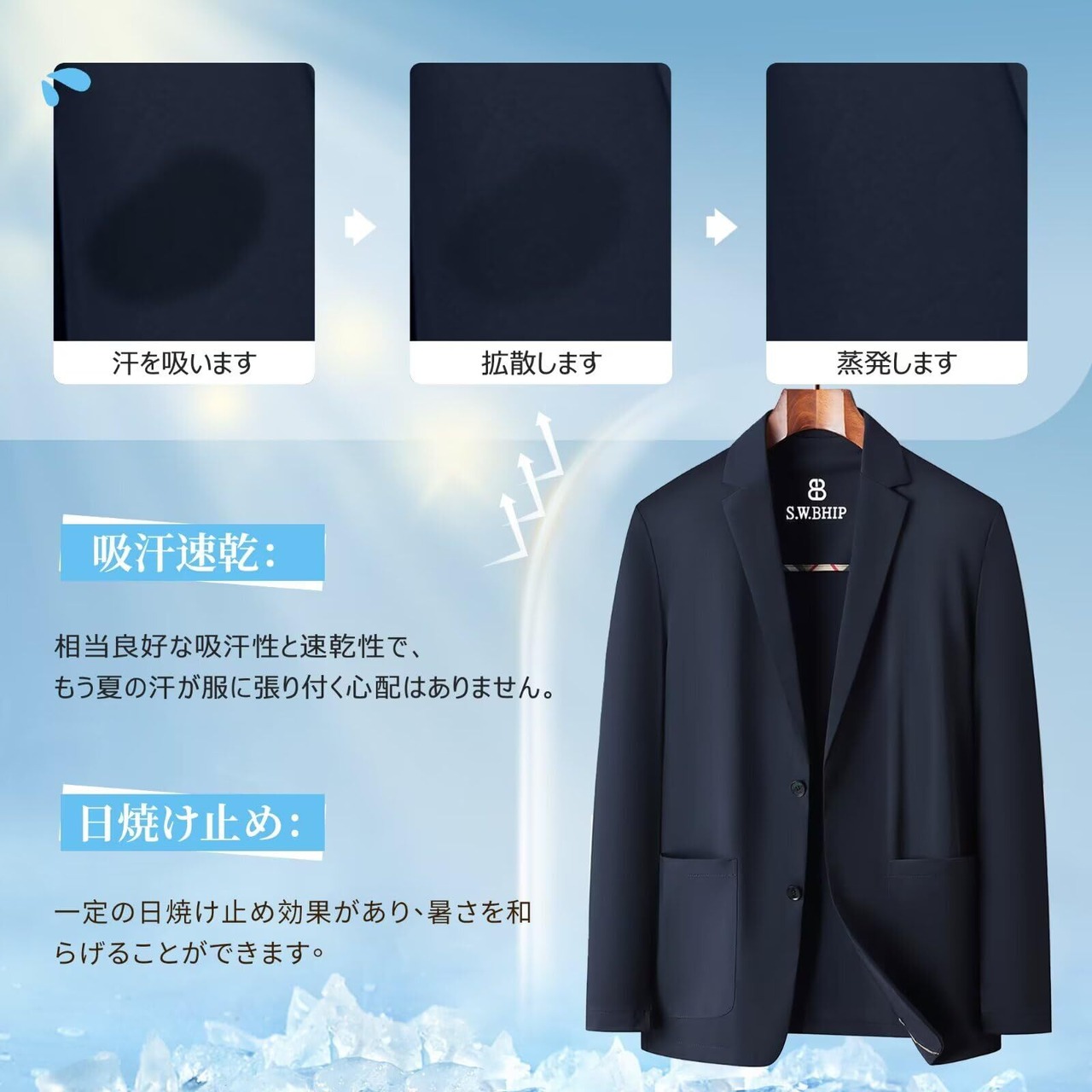 【デザイン&仕様ポイント】暑い夏に非常に適した冷感スーツジャケットです。クールで、弾力性があり、UVカット機能も備えています。内側の縫い目はすべて包み縫いで、内部は非常に清潔でさわやかに見えます。サイドポケットが2つあります。