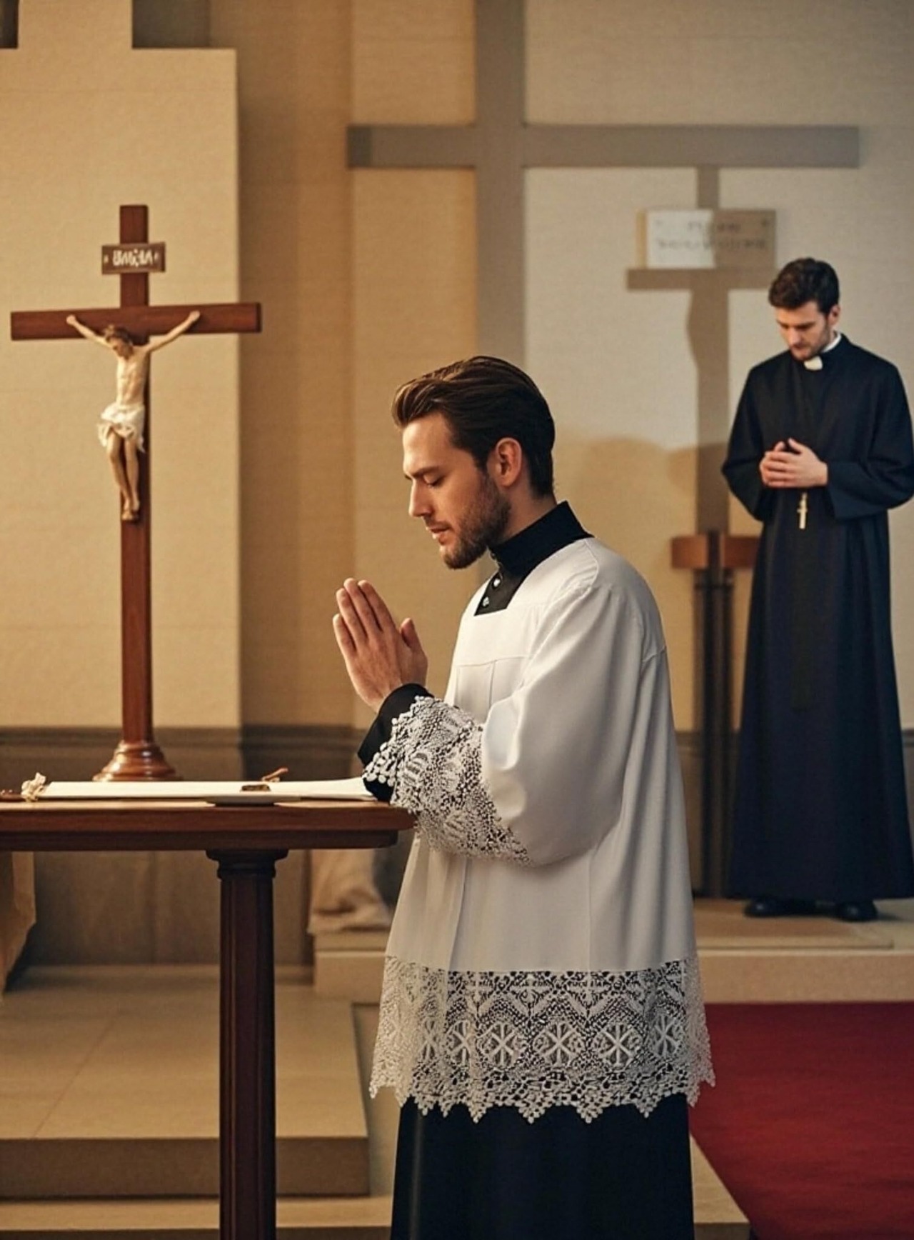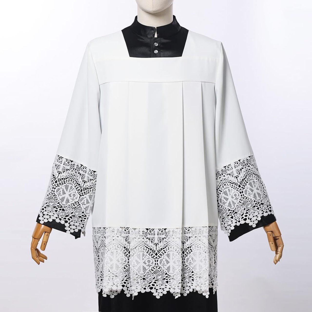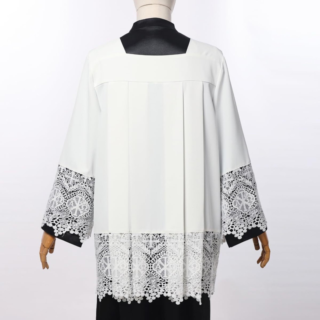上品な白色の法衣で、ひだレースが施されたディテールが特徴。聖職者や司祭にふさわしい優雅さを演出します。