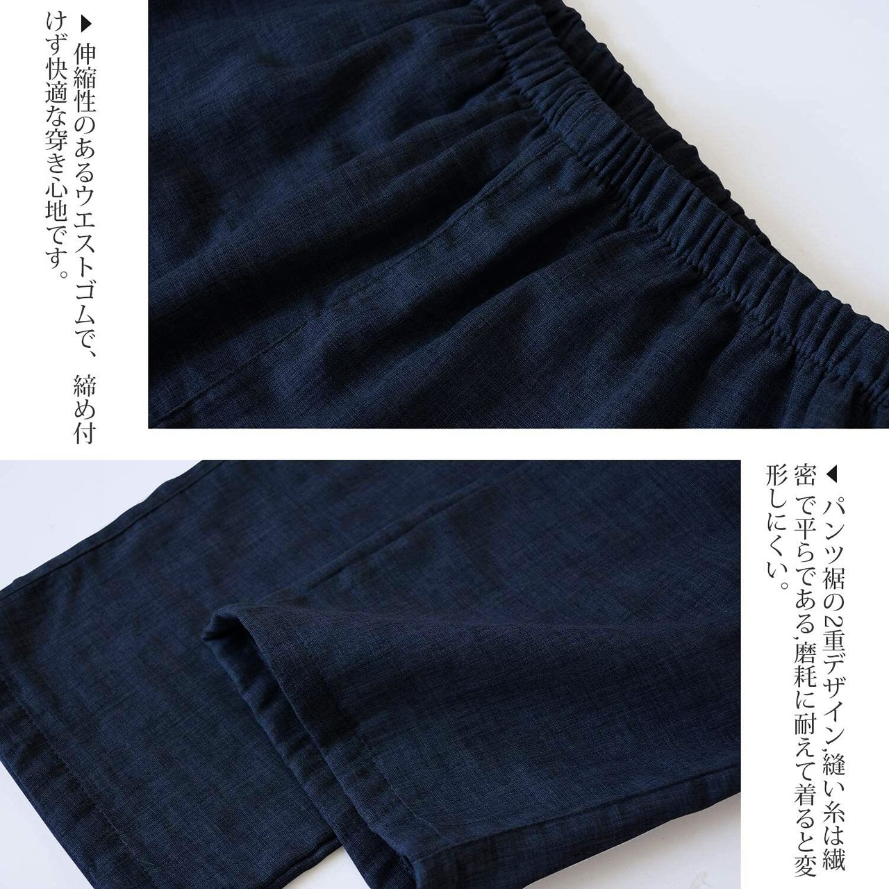【デザイン】優しい和風のルームウェア。便利な前開きタイプで着脱がしやすく、抜群の着心地の良さを味わえます。全体がゆったりとした作りで、上着は内紐と外紐を結んでご着用いただくタイプですので、お客様のサイズに合わせて調節していただけるおくつろ着です。パンツはウェストゴム入り伸縮性に優れお腹を締め付けない。