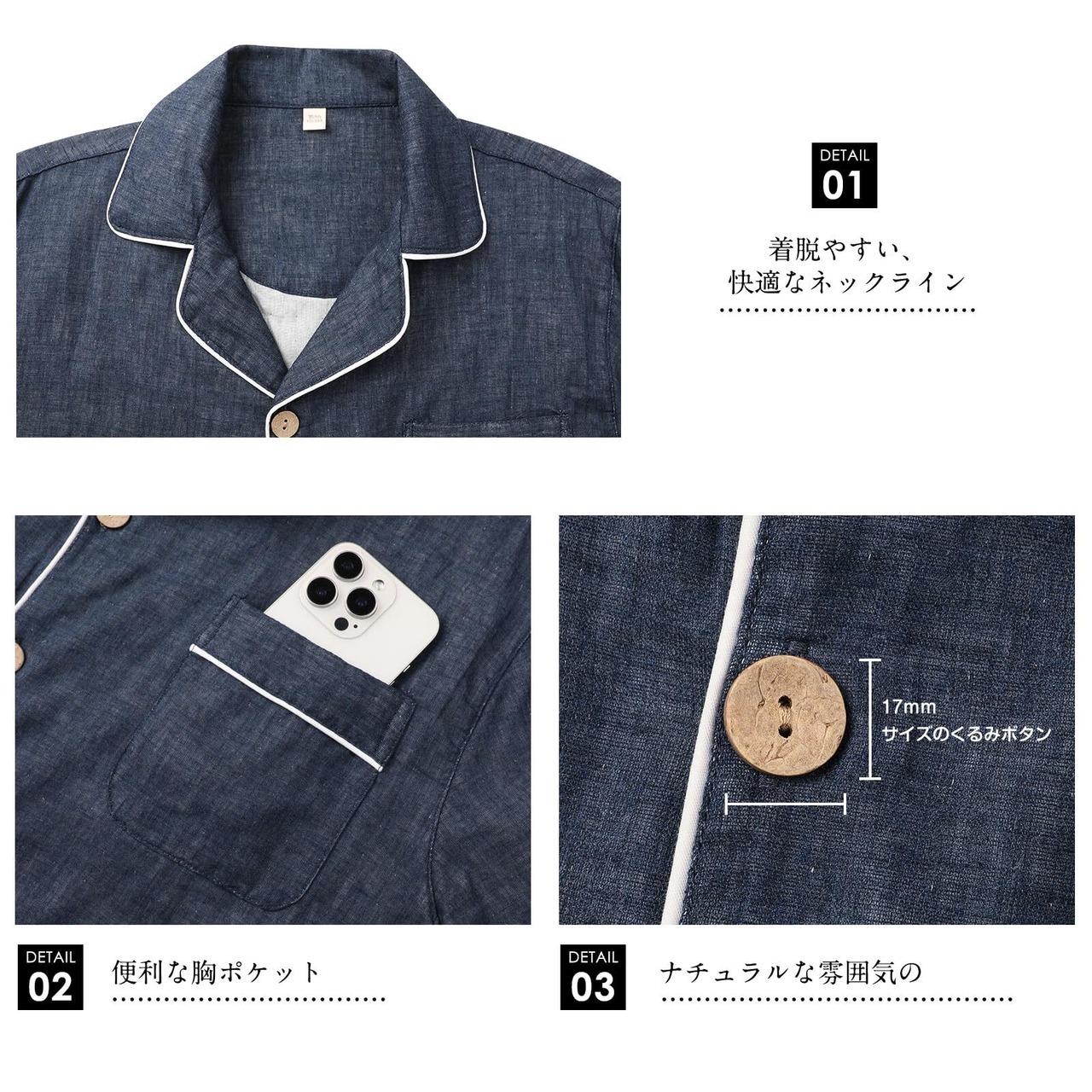 [レコーン] パジャマ メンズ 長袖 綿100% 二重ガーゼ 上下 セット ルームウェア 前開き ガーゼパジャマ 部屋着 肌に優しい 柔らか 吸汗通気 薄手 快適 おしゃれ 入院用 父の日 ギフト 春 夏 秋