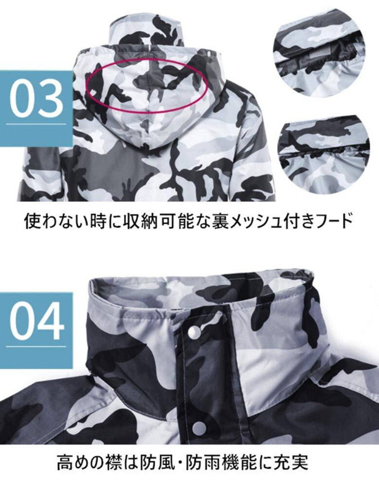【耐水・防水性能】耐水圧10,000㎜なので、傘・少雨(約300㎜)~大雨(1,500㎜)でも対応可能。また、前面のファスナー部分は、ファスナーとボタンで閉じる二重構造。袖先部分はゴムギャザー加工で二重になっており、雨風の侵入を防ぎながら、袖が捲くり上がるのを防ぎます。上着両サイドのポケットは蓋付きで雨の侵入を防ぎます。