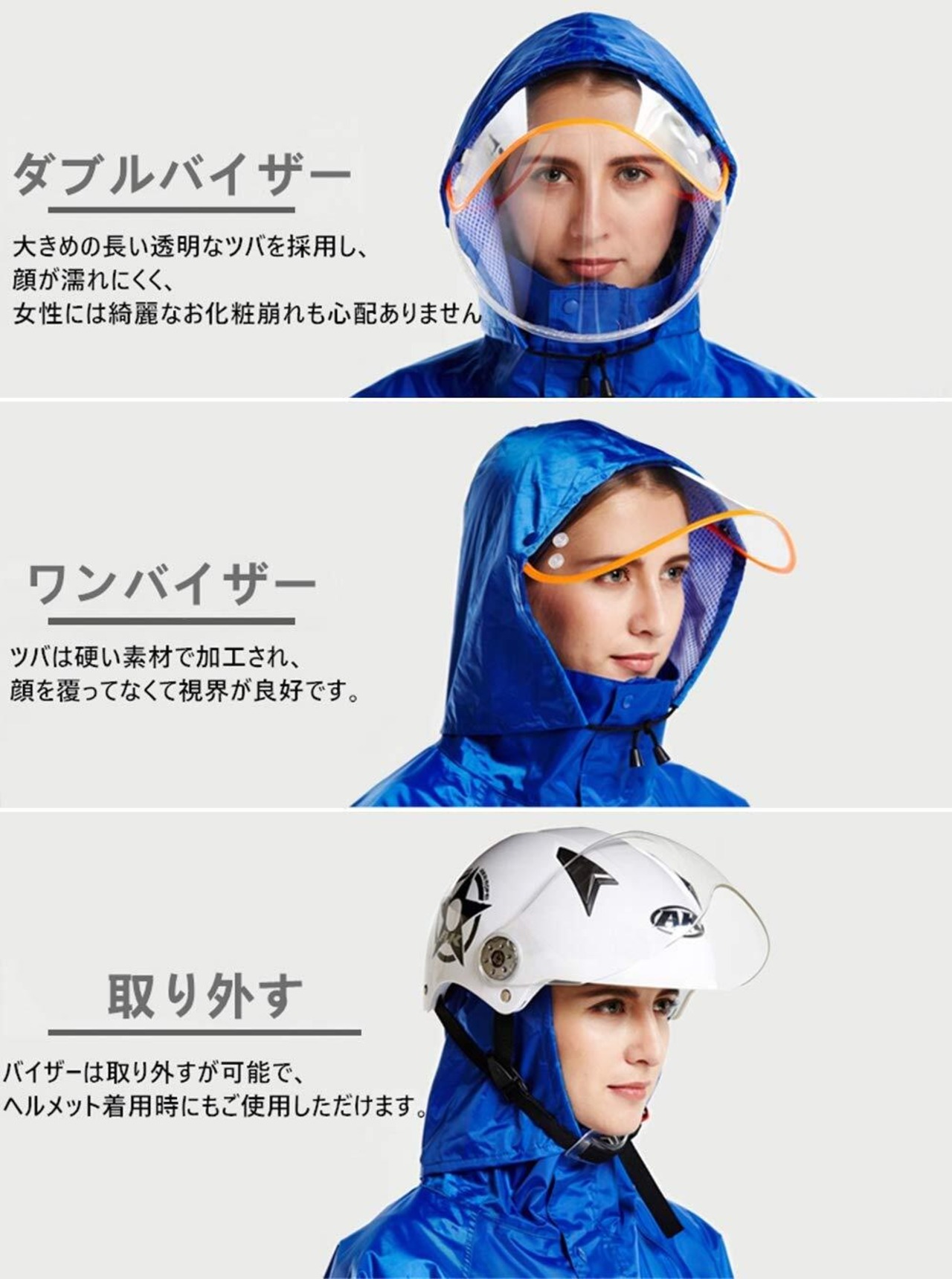 【バイザー付き】大きめの長い透明なバイザーを採用し、顔が濡れにくく、女性には綺麗なお化粧崩れも心配ありません。バイザーは硬い素材で加工され、顔を覆ってなくて視界が良好で、悪天候時でもしっかり視界を確保します。