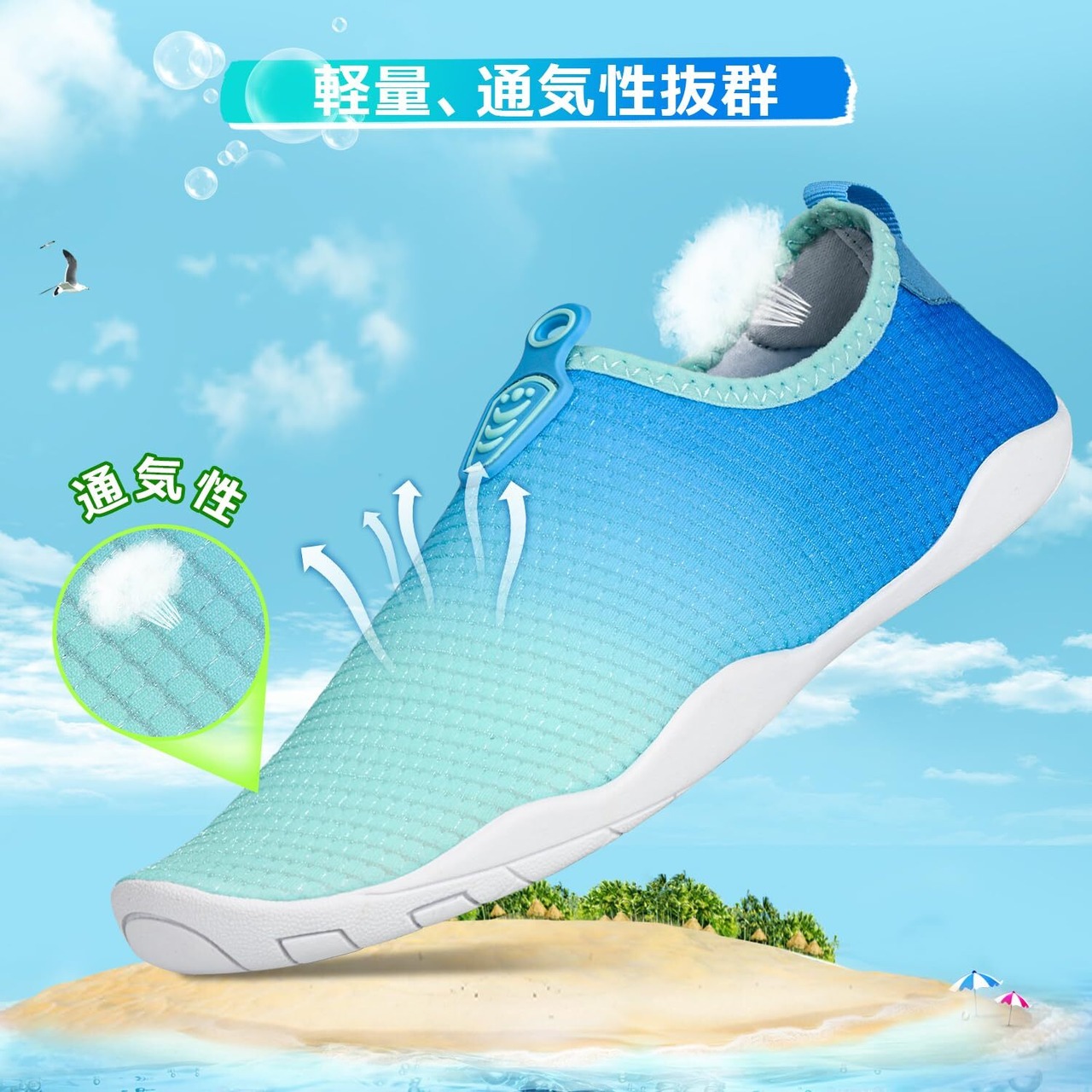【滑り止めソール】マリンシューズはゴム製アウトソールでグリップ力を高め、滑りにくいです。滑りやすい場所でも安心して使用できます。
