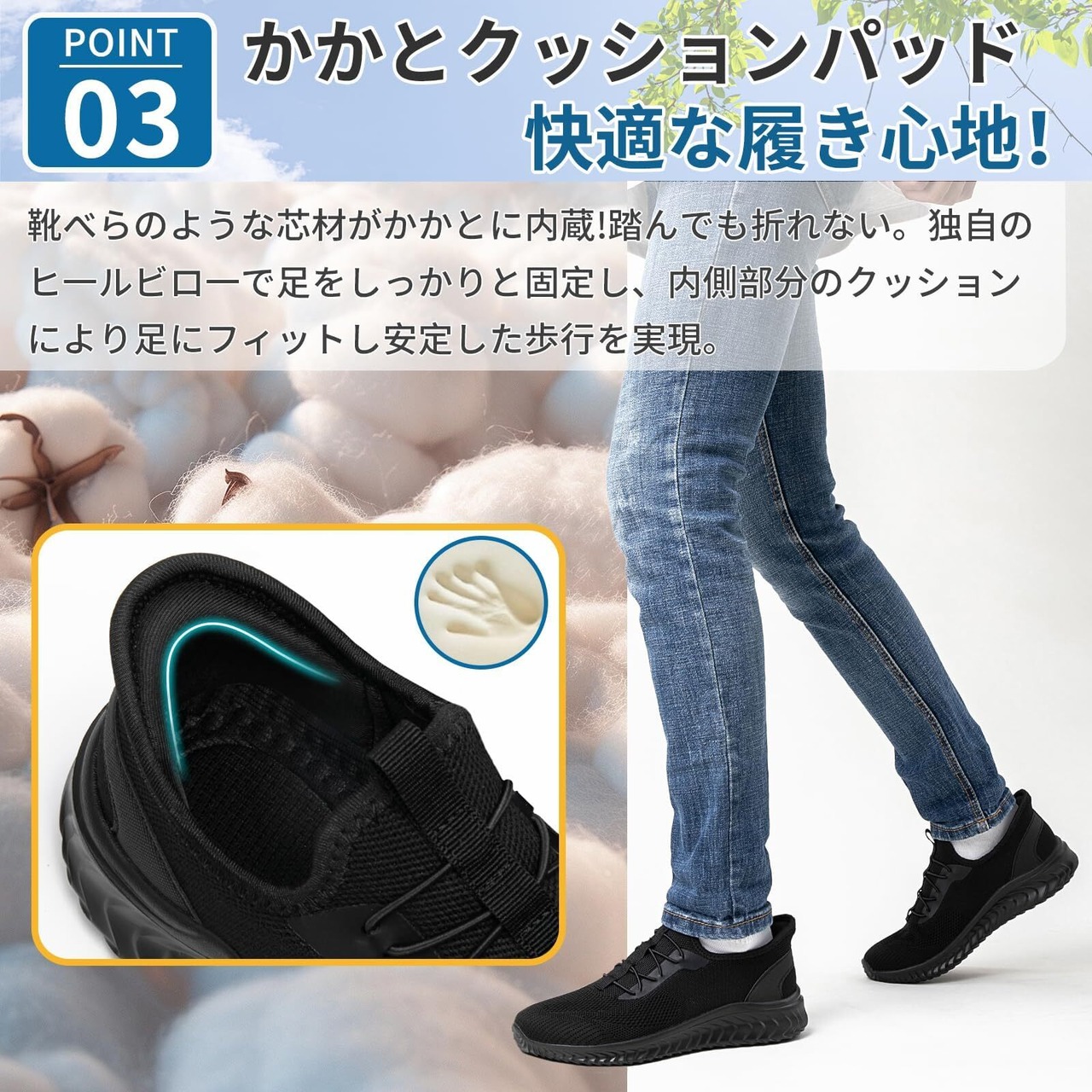 メッシュ スリッポン:アッパーには通気性抜群のメッシュ素材を採用し、長時間履いても靴内が蒸れにくく、夏場でも快適に履けます。歩くたびに空気が循環し、足元を快適に保ちます。さらに、足の形にしっかりフィットするデザインなので、外反母趾や甲高に悩む方にもおすすめ。一日中立ち仕事をされる方の足の疲れを軽減し、快適な履き心地を提供します。