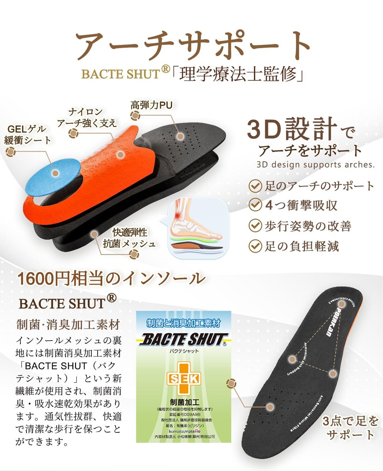 【理学療法士監修】オーダーメイドインソールの専門家である理学療法士の監修のもと、人間工学に基づいて設計された快足インソールです。硬質TPU素材によるアーチサポートが、100kg超の体重にも対応し、立ち仕事や長時間の歩行時の衝撃を吸収して疲れを軽減します。インソール表面の通気性メッシュには、抗菌・防臭効果に優れた「BACTE SHUT(バクテシャット)」を採用しています。