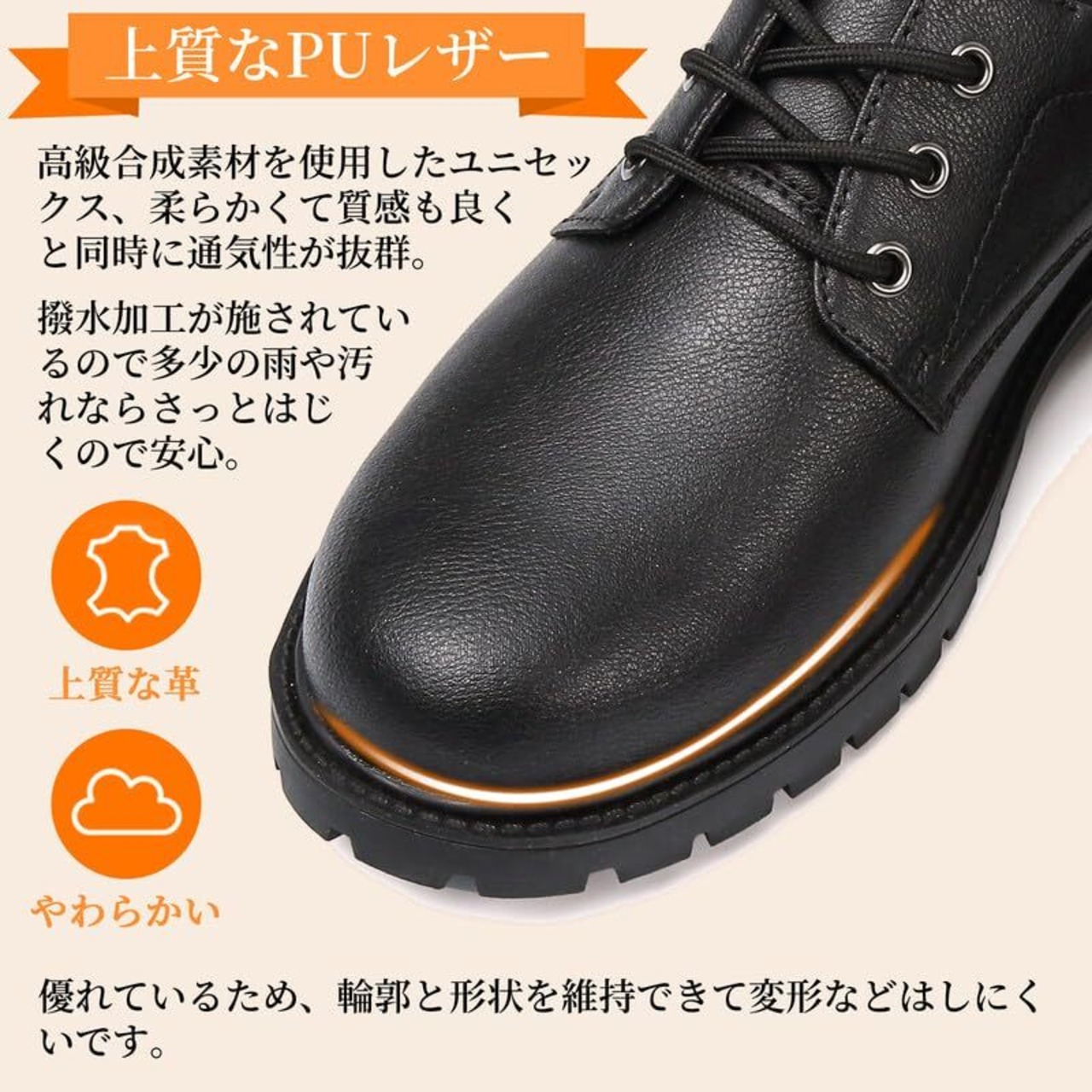 【上質なPUレザー】高級合成素材を使用したユニセックス、柔らかくて質感も良くと同時に通気性が抜群、例え長時間歩くと蒸し暑い感もありません。撥水加工が施されているので多少の雨や汚 れならさっとはじくので安心。優れているため、輪郭と形状を維持できて変形などはしにくいです。