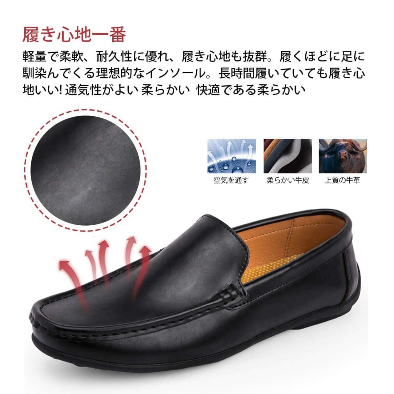 【高品質】足を包み込む革は柔らかい本革を使用。靴はのから作るので、質は更に柔軟で、合成繊維の異常なにおいがなくて、更に健康です。