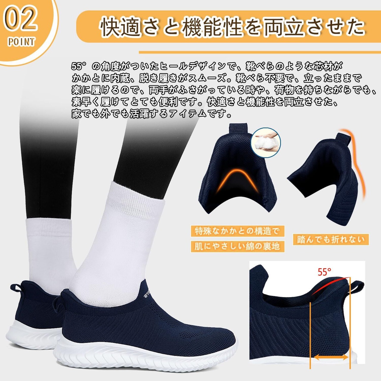 【1秒で简単に履ける・手を使わずに履ける靴】このスニーカーは、特殊なかかとの構造で、靴ベら不要で、足を滑らせるだけでぴったりフィット。長時間着用してもかかとの形が崩れることなく、いつでも快適な履き心地です。サッと履けるので、両手がふさがっている時や忙しい朝、急なお出かけにとても便利です。瞬時に履けて、ストレスフリーな履き心地。年配の方や妊娠中の方、そして頻繁に靴を着脱する方にも最適です。快適さと機能性を両立させた、家でも外でも活躍するアイテムです。