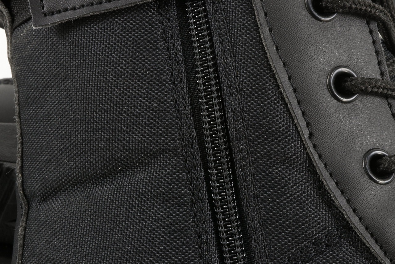 両足 内側に サイドジッパー が付いている為、脱履きが容易です。端部はマジックテープで留める方式です。ハイカットブーツ に ありがちな 「いちいち靴紐を緩めたりしないと脱げない」といったことなく、すばやい 脱ぎ履き が可能となっています。