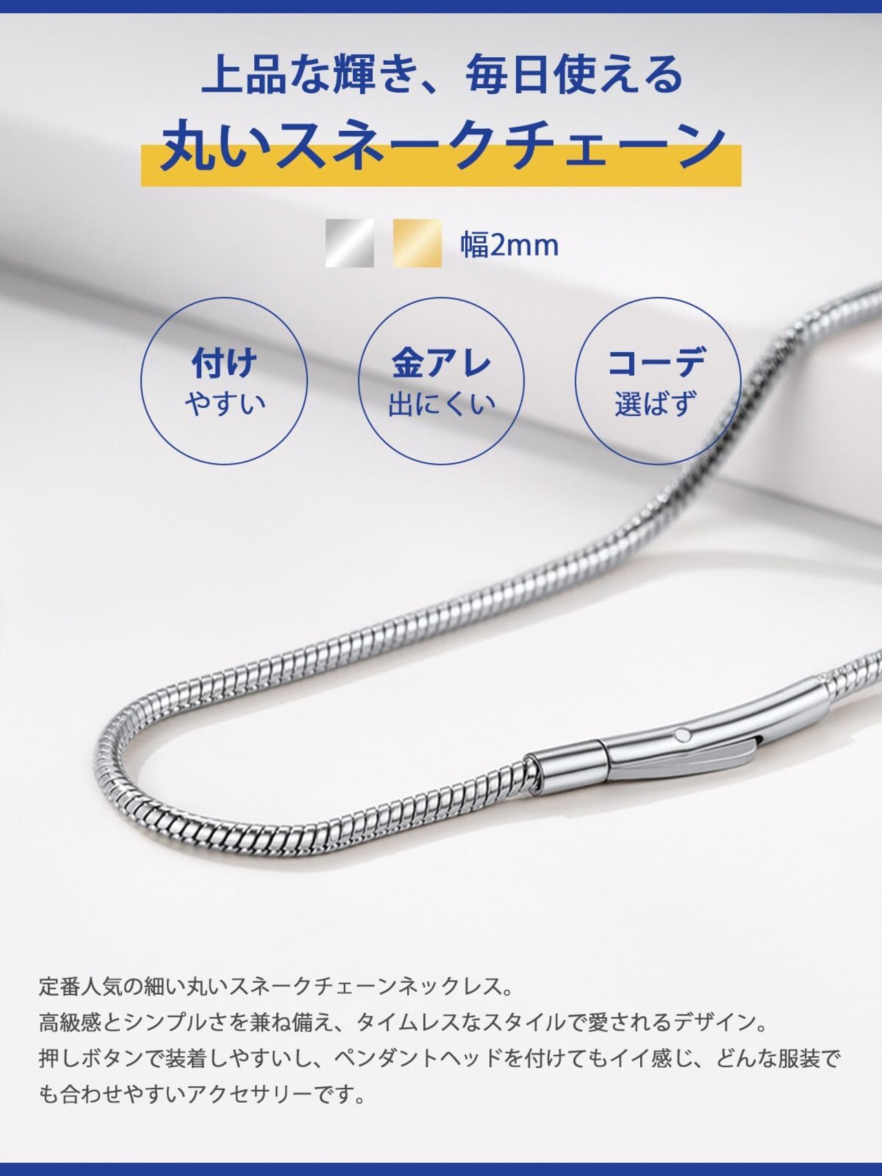 【デザイン】2mm極細丸いスネークチェーンが登場!シルバー・ゴールド・ブラックの3つのカラーからお選び頂けます。お好みのトップを合わせて、自分らしくのファッションを楽しめます。