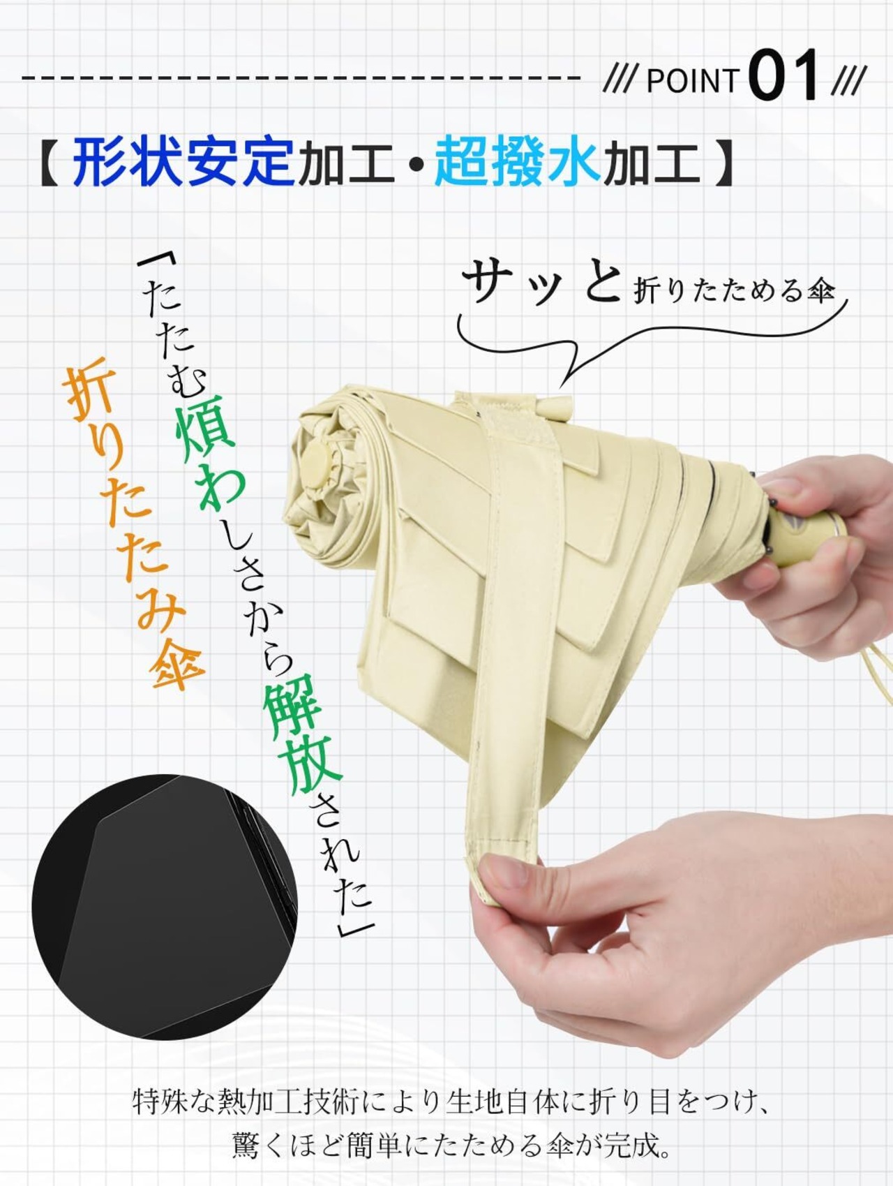 【2025進化系・形状記憶加工・3秒ととのえる!】おりたたみ傘の畳みにくい難点を解消するために開発した「形状記憶加工」シリーズがついに登場しました!傘布を形状記憶加工することで、日傘を閉じた時折り目に沿ってピシッと揃えることが可能になりました。このまま留め具を閉めれば、あっという間にキレイに収納できちゃいます。非常に簡単に傘布を揃えて閉じることができるので、これまで苦手意識のあった方も使う煩わしさが軽減され、折り畳み傘をグシャグシャにたたみたくない方には特におすすめです。