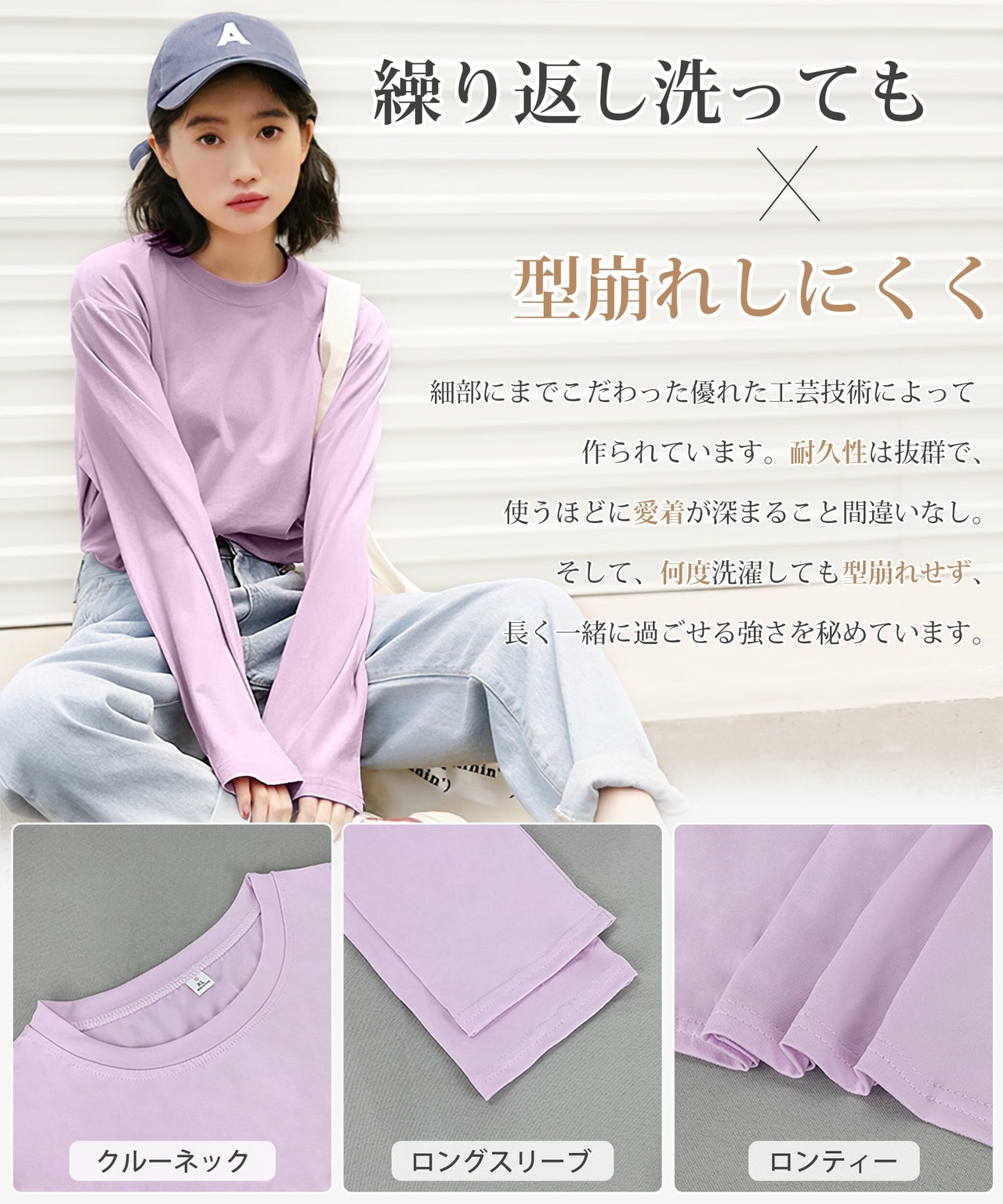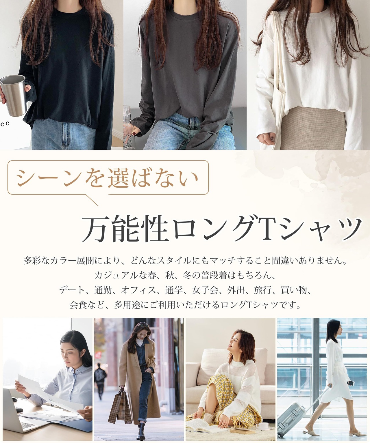 【秋冬の定番本命長袖 Tシャツ】肌寒さが感じられるこの季節にぴったりの、軽やかで保温性の高い素材を選び長袖 Tシャツが今年も登場です!上品なラウンドネックのデザインは、首元を美しく引き立て、顔周りに小顔効果を演出する長袖 Tシャツ。定番のクルーネックデザインは、どんな体型にも適しており、洗練された雰囲気を醸し出します。すっきり見えつつも体のラインを拾わないシルエットや、ややゆとりのある長袖で気になる二の腕をカバーできるのも魅力的。心を包み込むようなロングスリーブタイプは、寒い風を遮断し、お客様の心と身体を温めます。