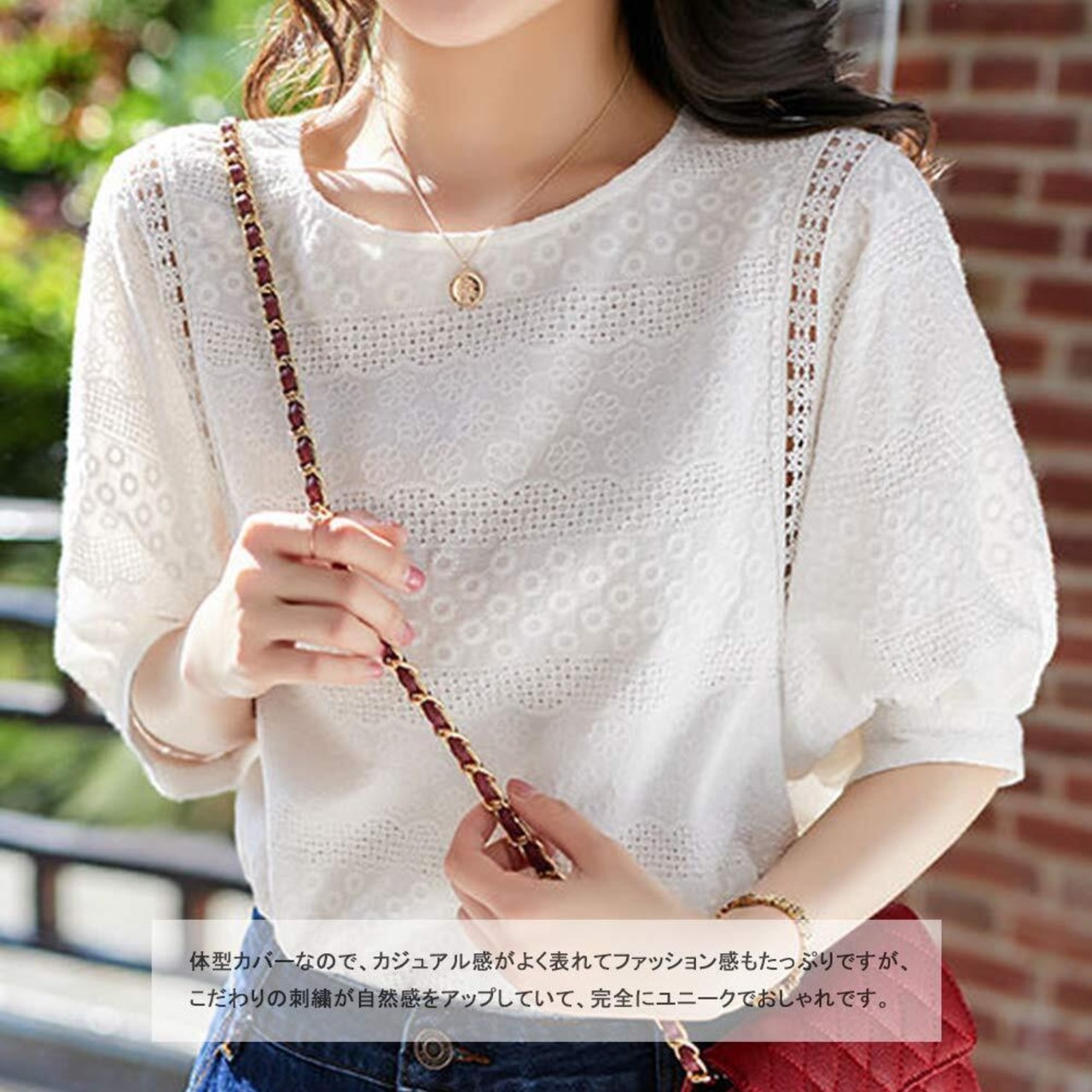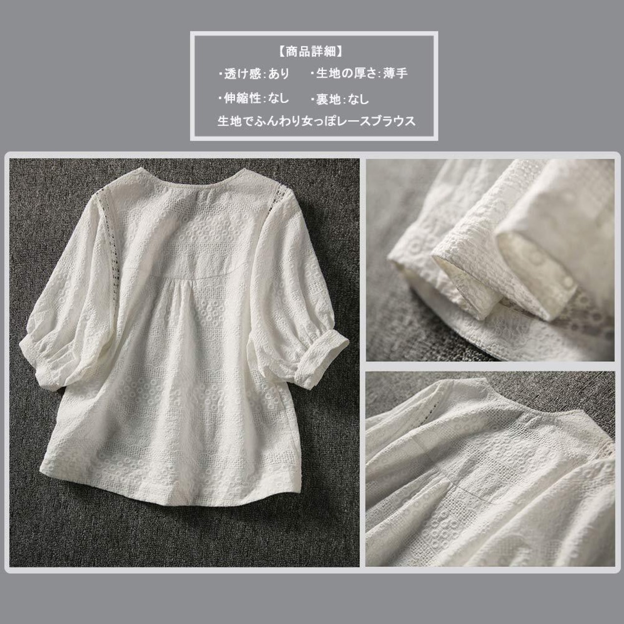 [Yino] (イノ) レース シャツ ブラウス レディース トップス 小花 刺繍 半袖 Uネック 透かし編み 着痩せ 可愛い おしゃれ ボリュームスリーブ 女性らしい カジュアル 通勤 デート お出かけ