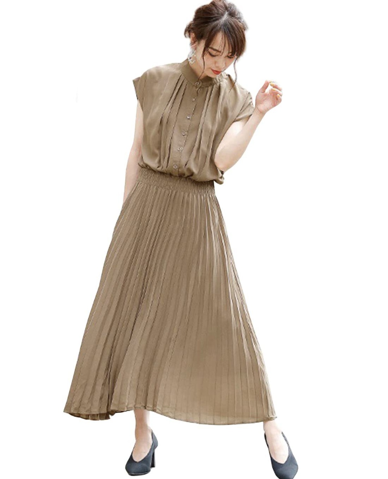 ワンピースのウエスト部分にワイドベルトデザインで立体的な形になり、着痩せ効果も期待できます。スッキリとした印象も作れるおしゃれなワンピースはカジュアルにもちろん、パーティードレスにもお勧めします。