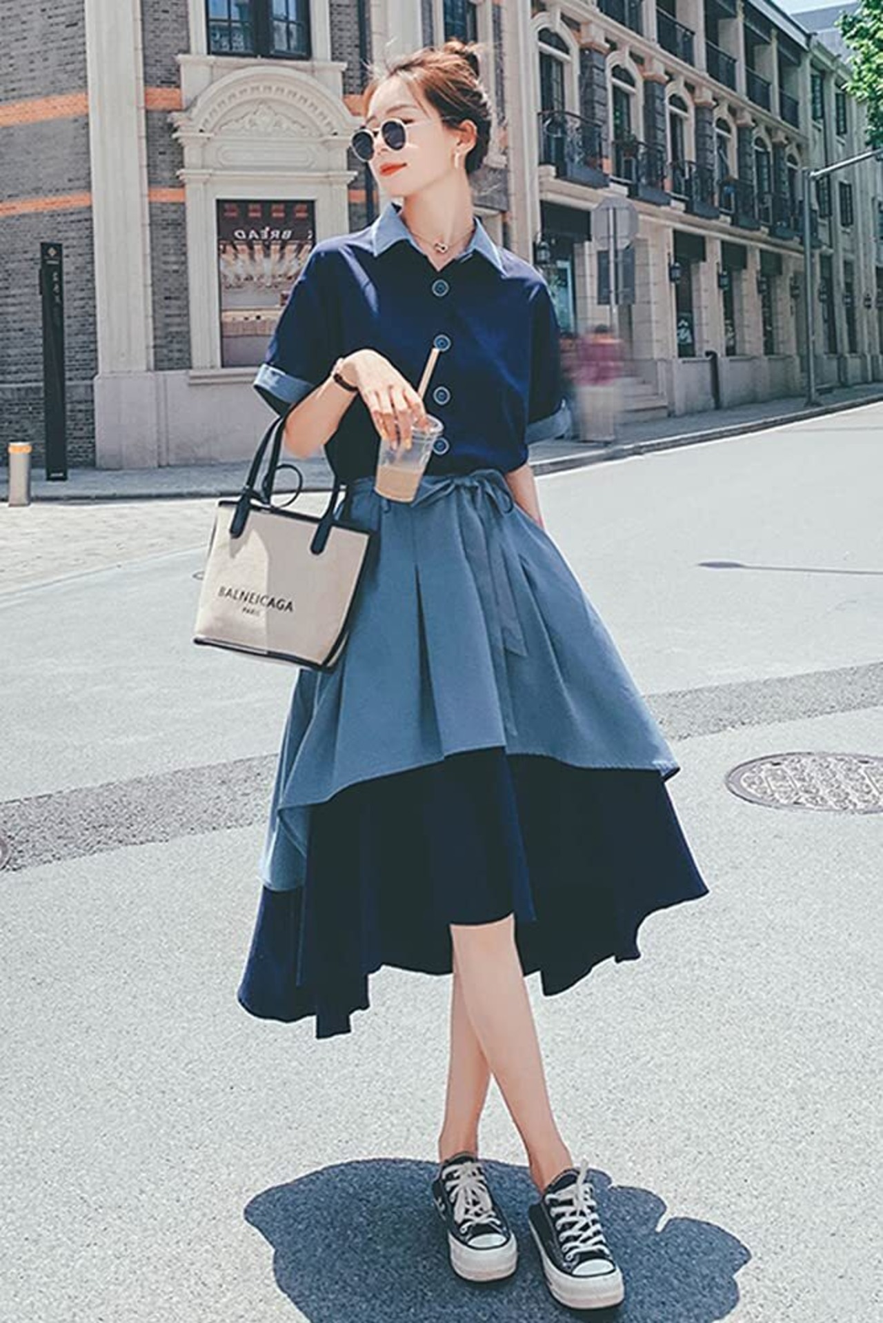 ふわふわ感のあるゆったりスリーブは腕を細く綺麗に魅せてくれます。下半身はコントラストカラー配色のティアードスカートできれいに見えて女性のエレガントな気質も演出してくれます。