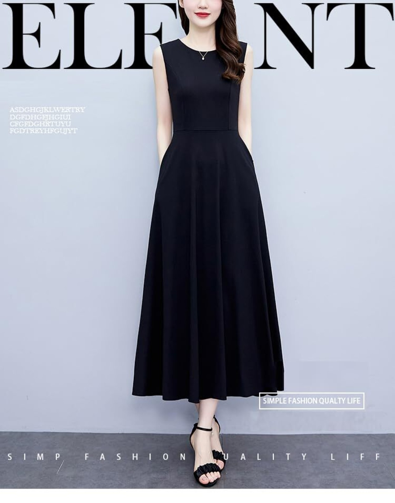 [DREKOBOS] a ライン大きいサイズ ワンピースノースリーブ上品ロングワンピース黒夏M-5XL