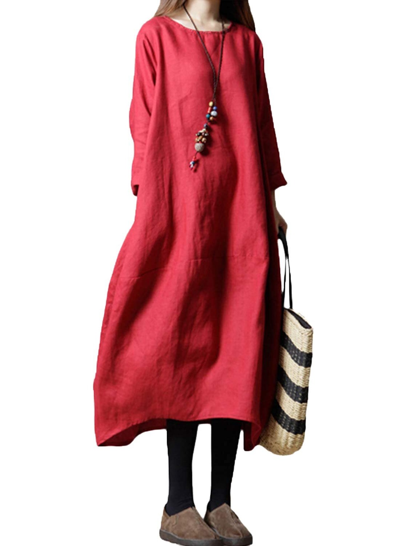 [JINJUDUO] ワンピース レディース ロングワンピース 夏 長袖 薄い コットンリネンワンピース 着痩せ チュニック マキシ丈 トップス ゆったり 無地 秋 綿 体型カバー 大きいサイズ レディース服