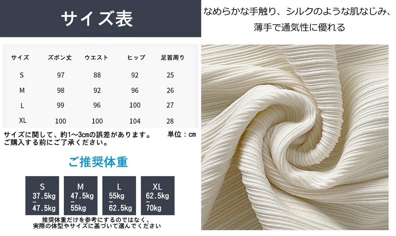 サイズ:S「ズボン丈:97cm ウエスト:88cm ヒップ:92cm 足首周り:25cm 推奨体重:37.5kg-47.5kg」M「ズボン丈:98cm ウエスト:92cm ヒップ:96cm 足首周り:26cm 推奨体重:47.5kg-55kg」L「ズボン丈:99cm ウエスト:96cm ヒップ:100cm 足首周り:27cm 推奨体重:55kg-62.5kg」XL「ズボン丈:100cm ウエスト:100cm ヒップ:104cm 足首周り:28cm 推奨体重:62.5kg-70kg」