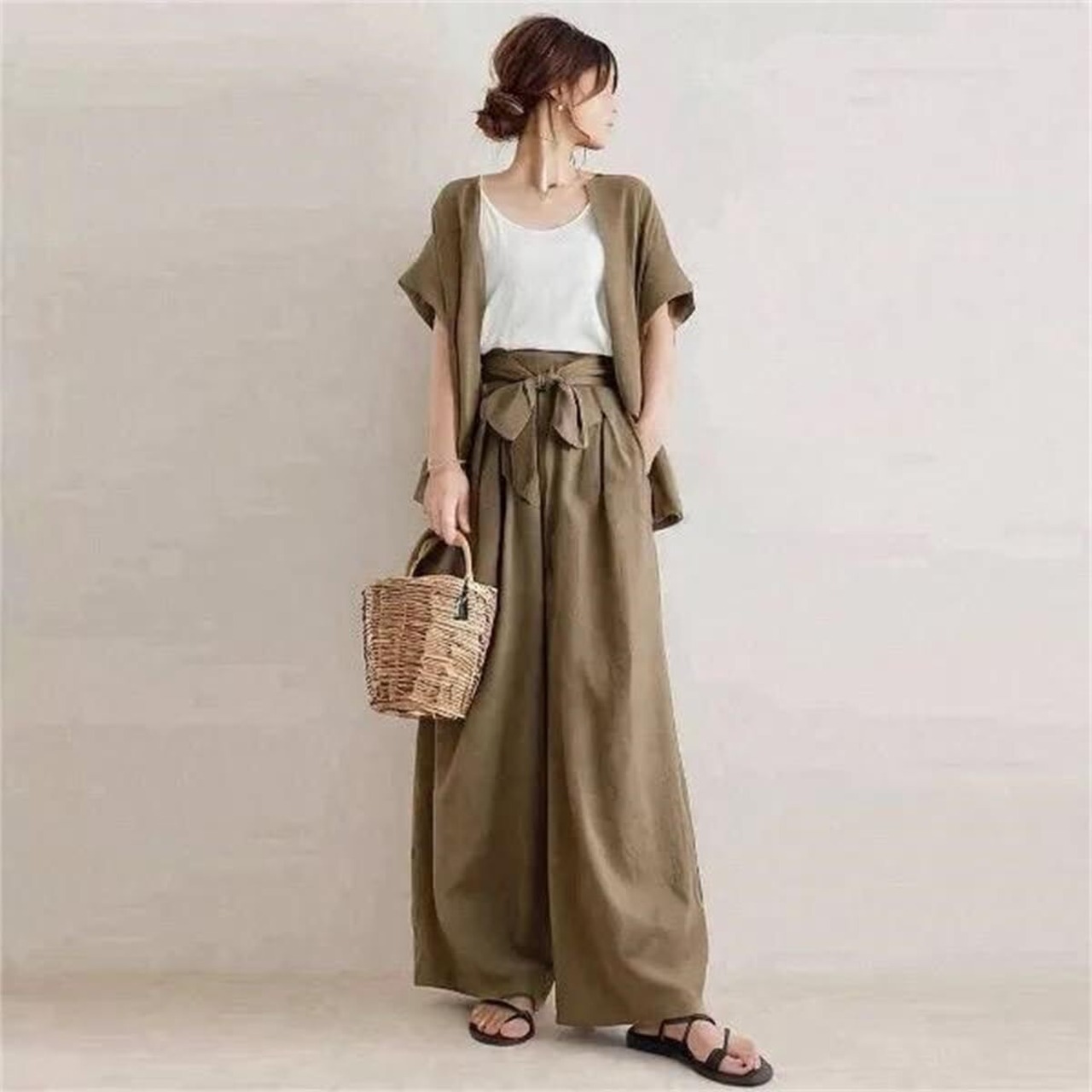 [YUANYUAN] 2点セット レディース アウター&ロングパンツ セットアップ 夏アウター パンツスーツ 夏服 ワイド 半袖 ボウタイ 無地 ポケット付き アンクル丈 カジュアル ゆったり 体型カバー 可愛い お洒落 シンプル 通勤 通学 大人 春夏