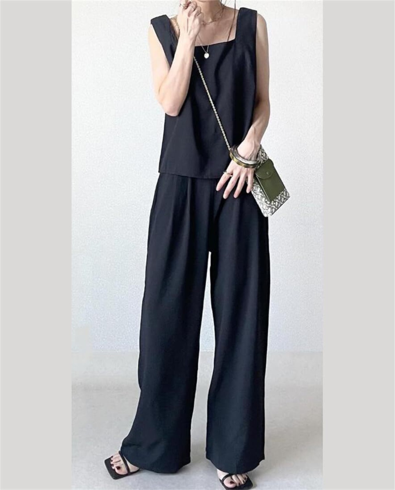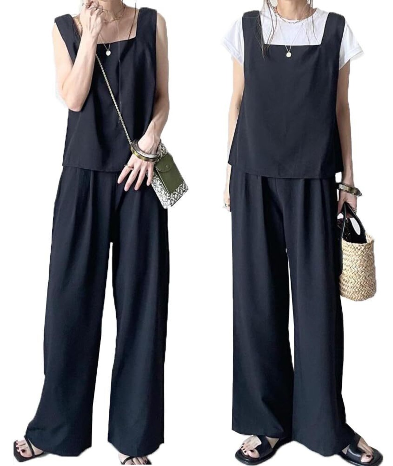 [DYIOPMFGZ] レディース セットアップ ベスト ワイドパンツ 2点セット トップス ノースリーブ tシャツ ロングパンツ 上下セット ガウチョパンツ プルオーバー パンツスーツ ズボン パンツドレス カットソー 袖なし カジュアル 夏 スクエアネック