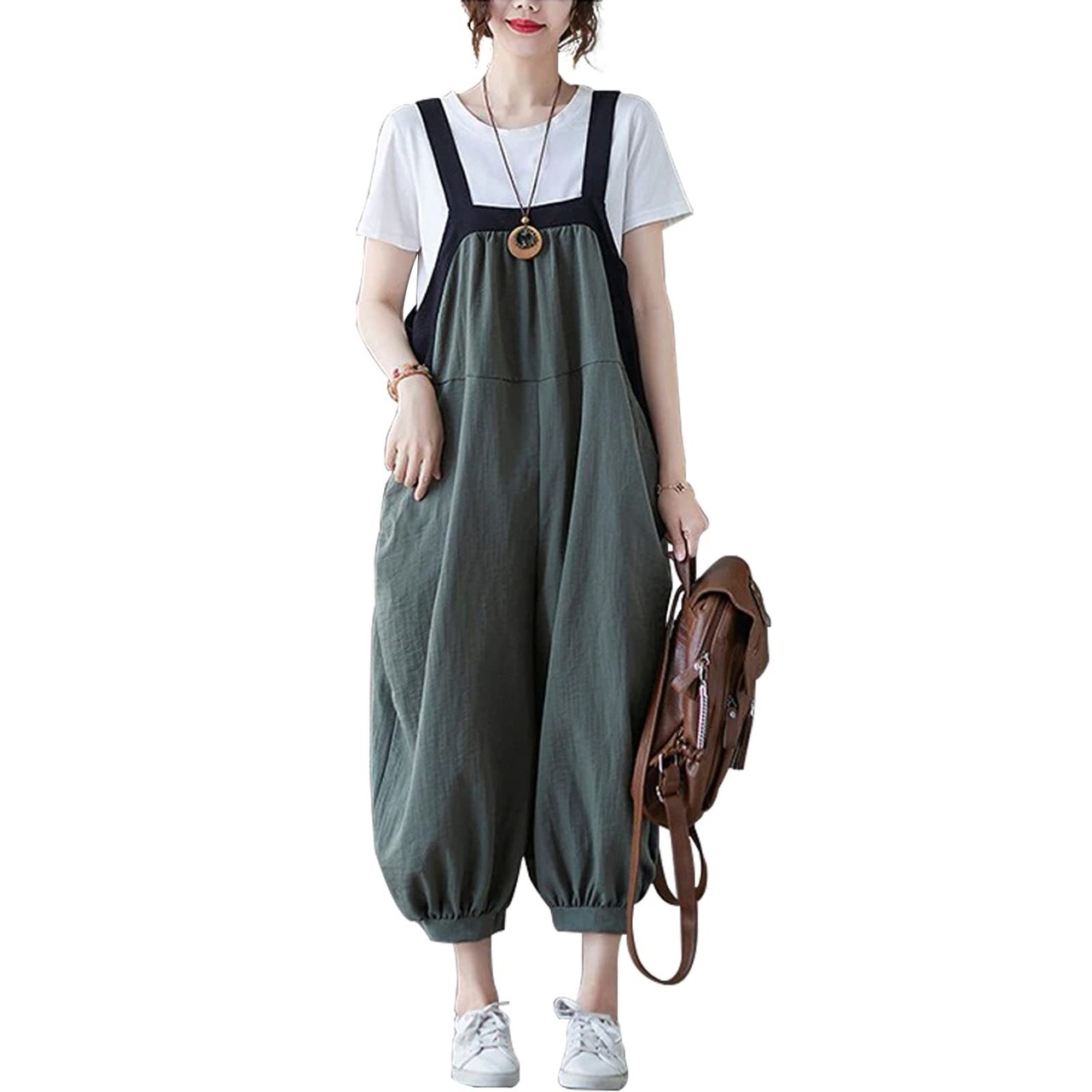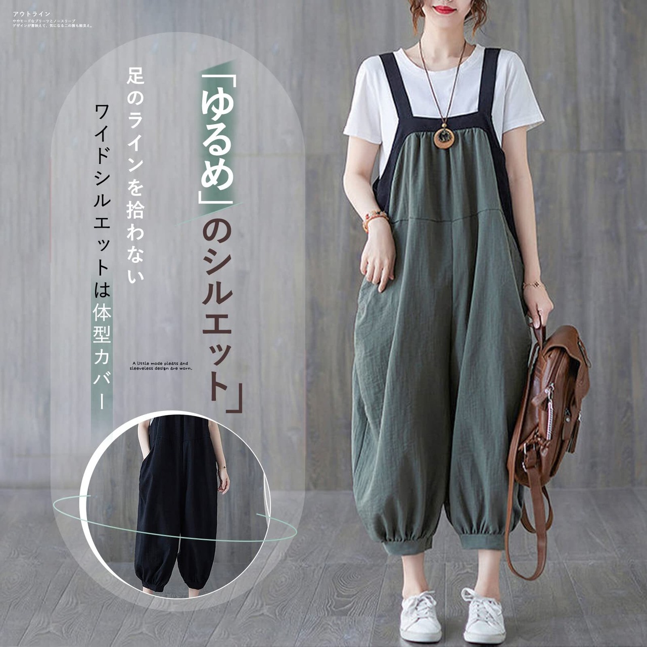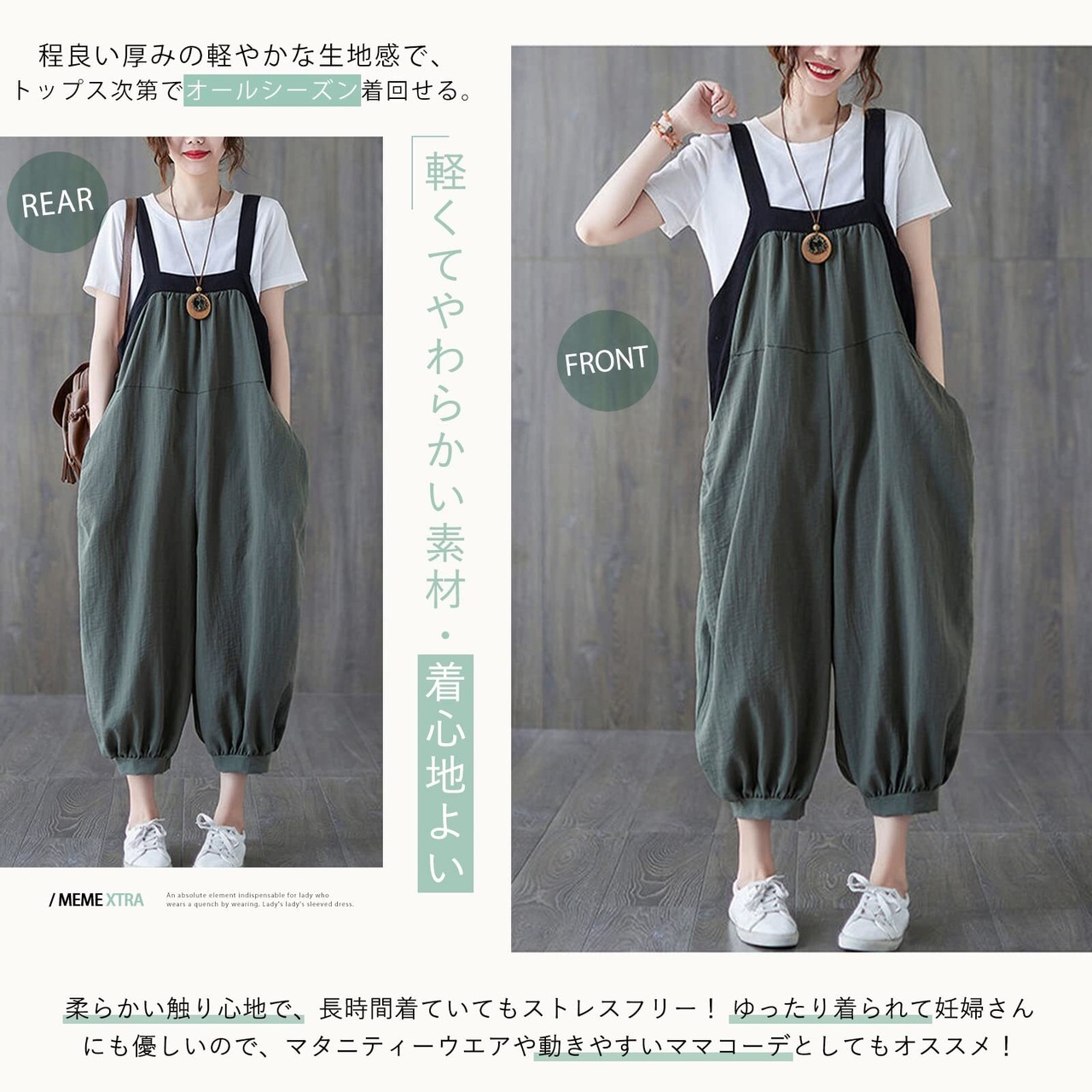 [MEME XTRA] メメエクストラ サロペット レディース オールインワン オーバーオール リネン ロングパンツ 秋 冬 ゆったり 大きいサイズ カジュアル パンツ ロング 無地 着痩せ ボトムス 綿麻 涼しい シンプル ワイドパンツ 韓国 黒 グリーン