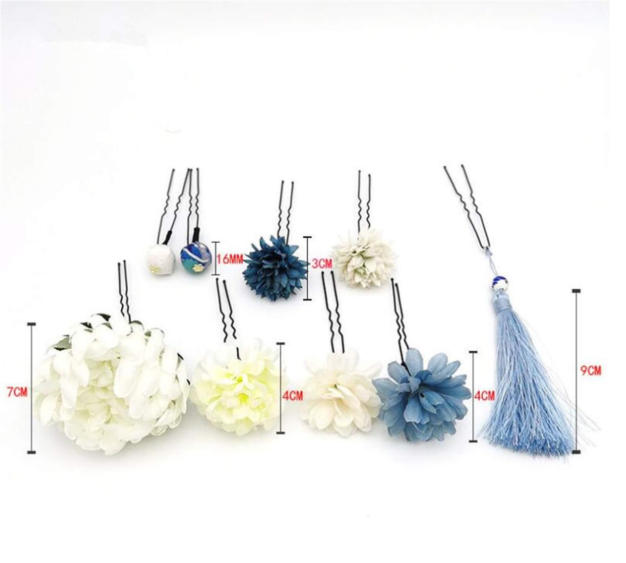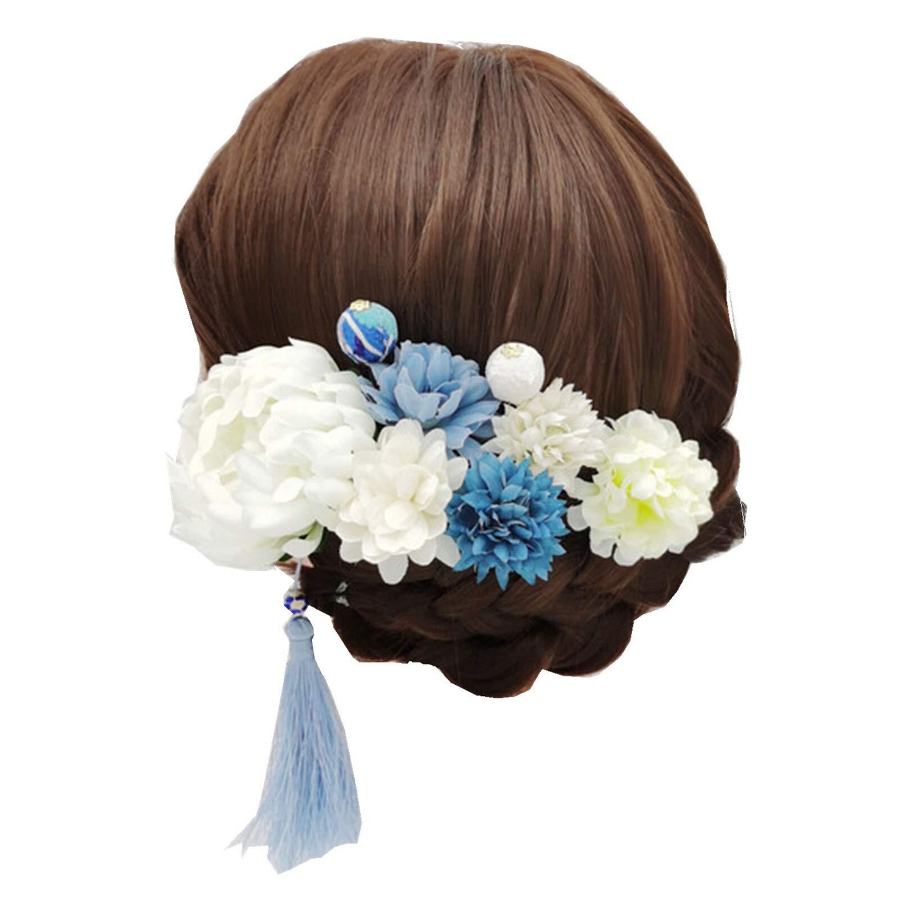 [Kingsiely] 髪飾り 和装 9点セット 花 タッセル ヘアピン Uピン ヘアアクセサリー 成人式 七五三 卒業式 着物 浴衣 振袖 (ブルー)