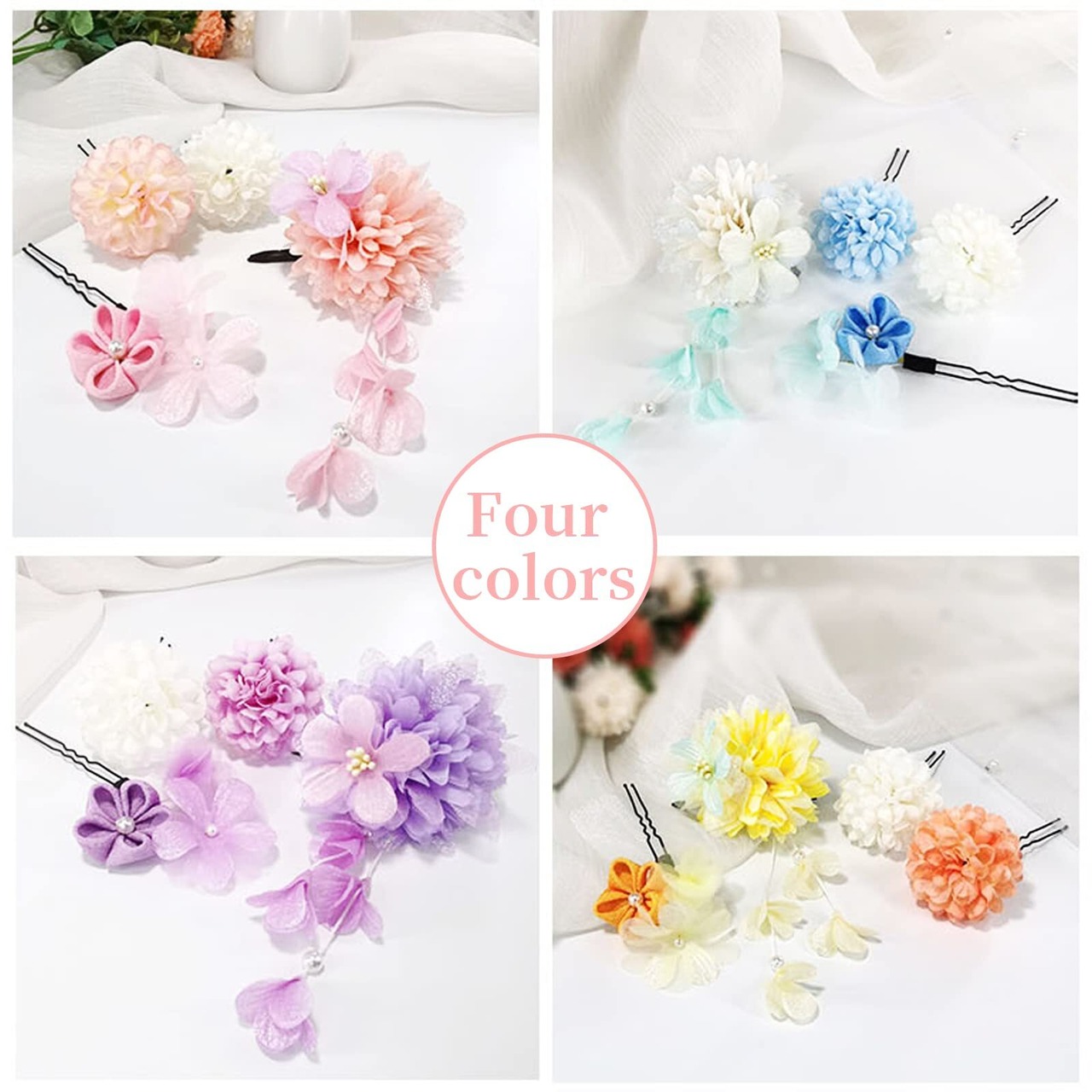 和風 和装 髪飾り 4点セット レディース 浴衣 飾り 花 タッセル ヘアピン Uピン 菊 ヘアクリップ 浴衣 着物 振袖 袴 髪飾り 卒業式 和装 成人式 結婚式 七五三 パーティー 謝恩会 お正月 花火大会 花 ドライフラワー 髪留め ヘアアクセサリー (A-青)