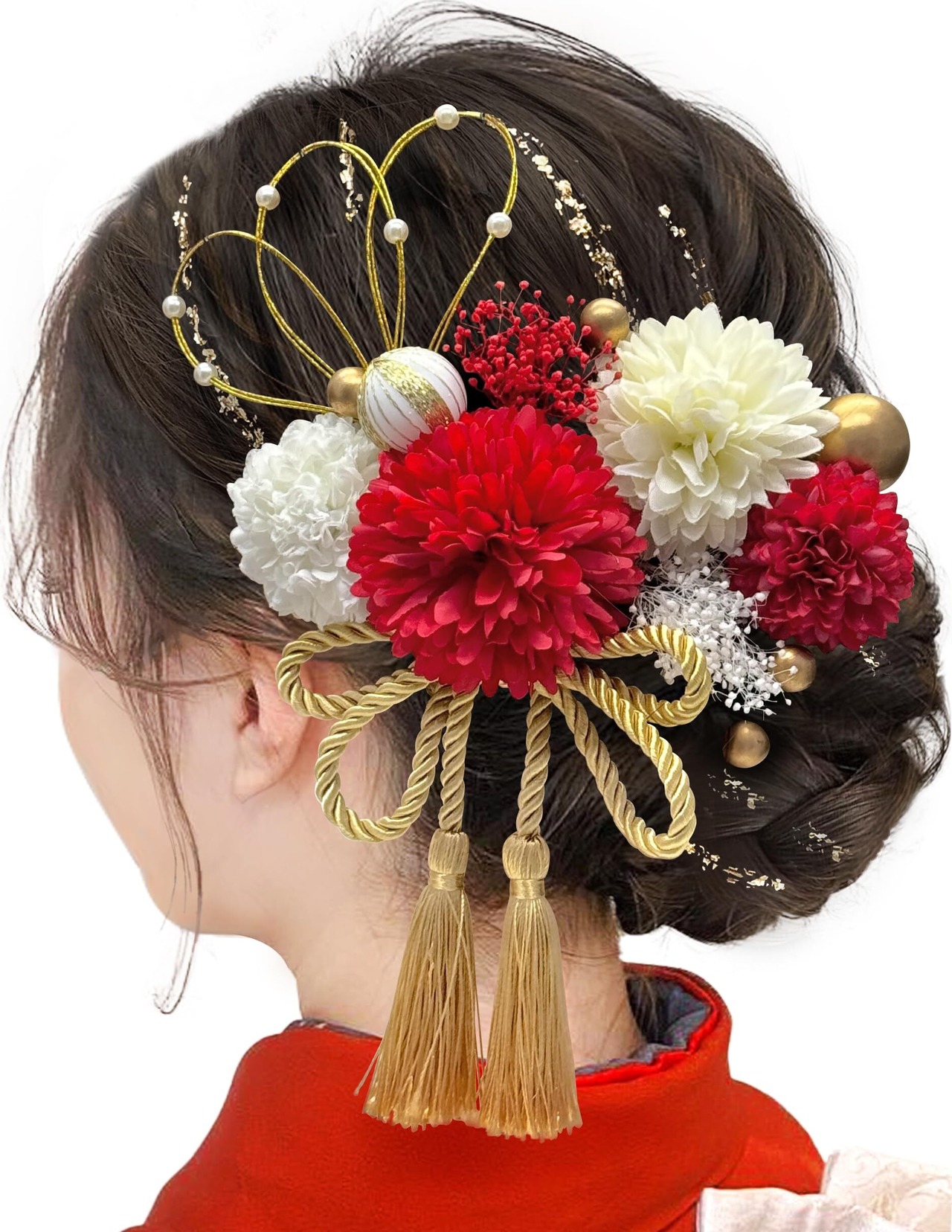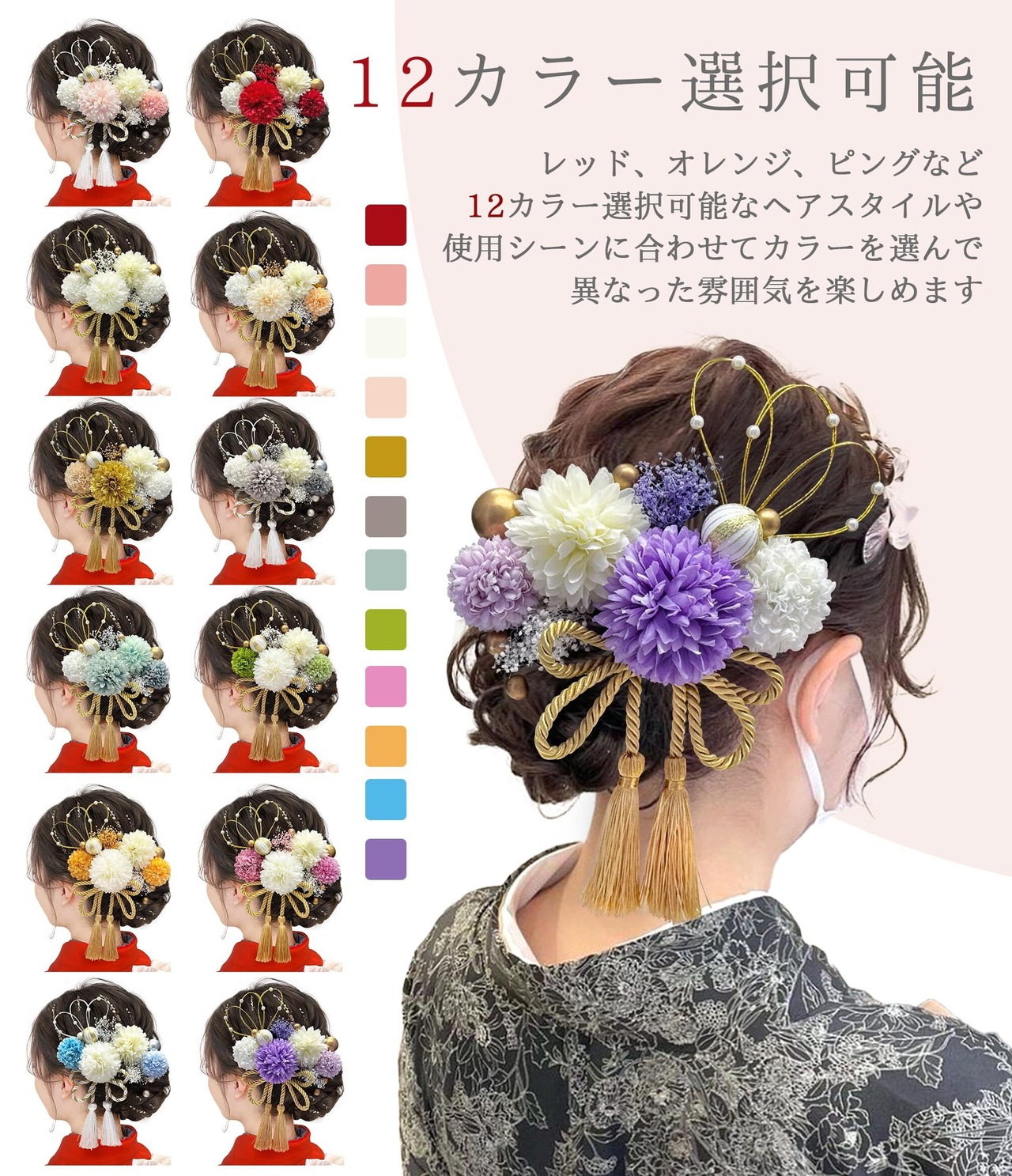 【ユニークなデザイン】伝統と現代の要素を融合しているデザインです。この髪飾りは金色の結び水引とかすみ草がエレガントな形に編み込まれ、アンティークベリーと和玉が間を彩っています。精緻なピンポンマムとの組み合わせが、ラグジュアリー感をプラスしています。合計12カラーが選択可能です。