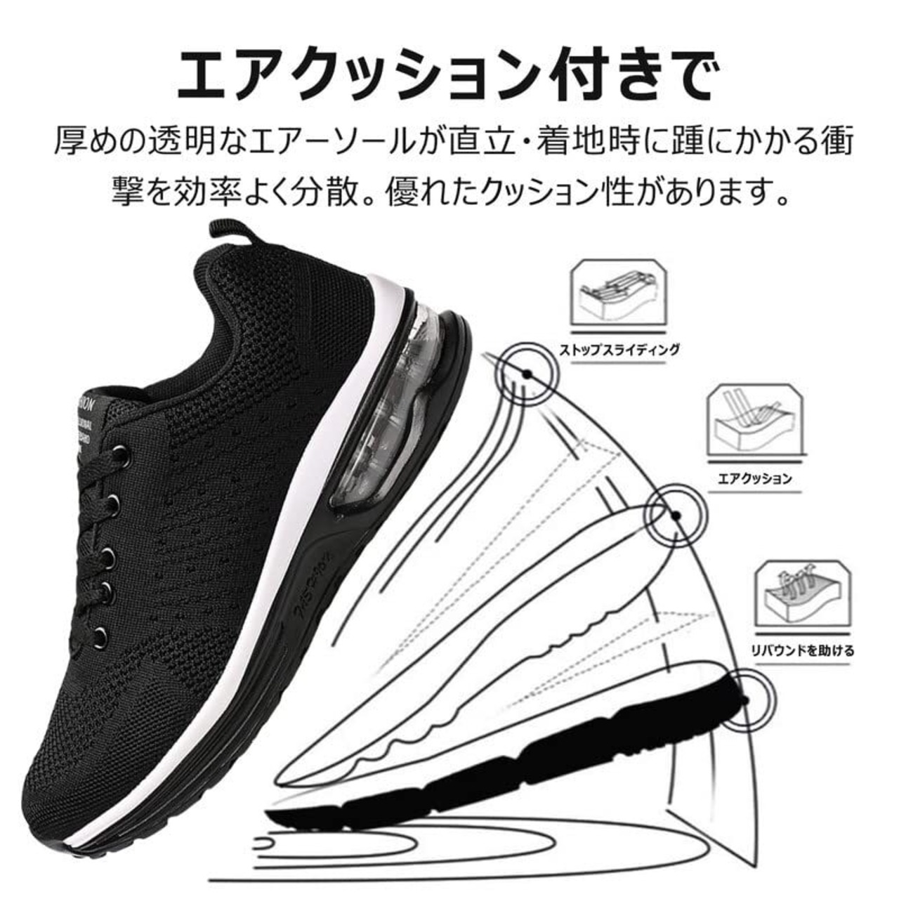 【クッション性】エアクッション付きで、クッション性に優れ、踏み込む際の衝撃を吸収し、とても歩きやすくて疲れにくいです。
