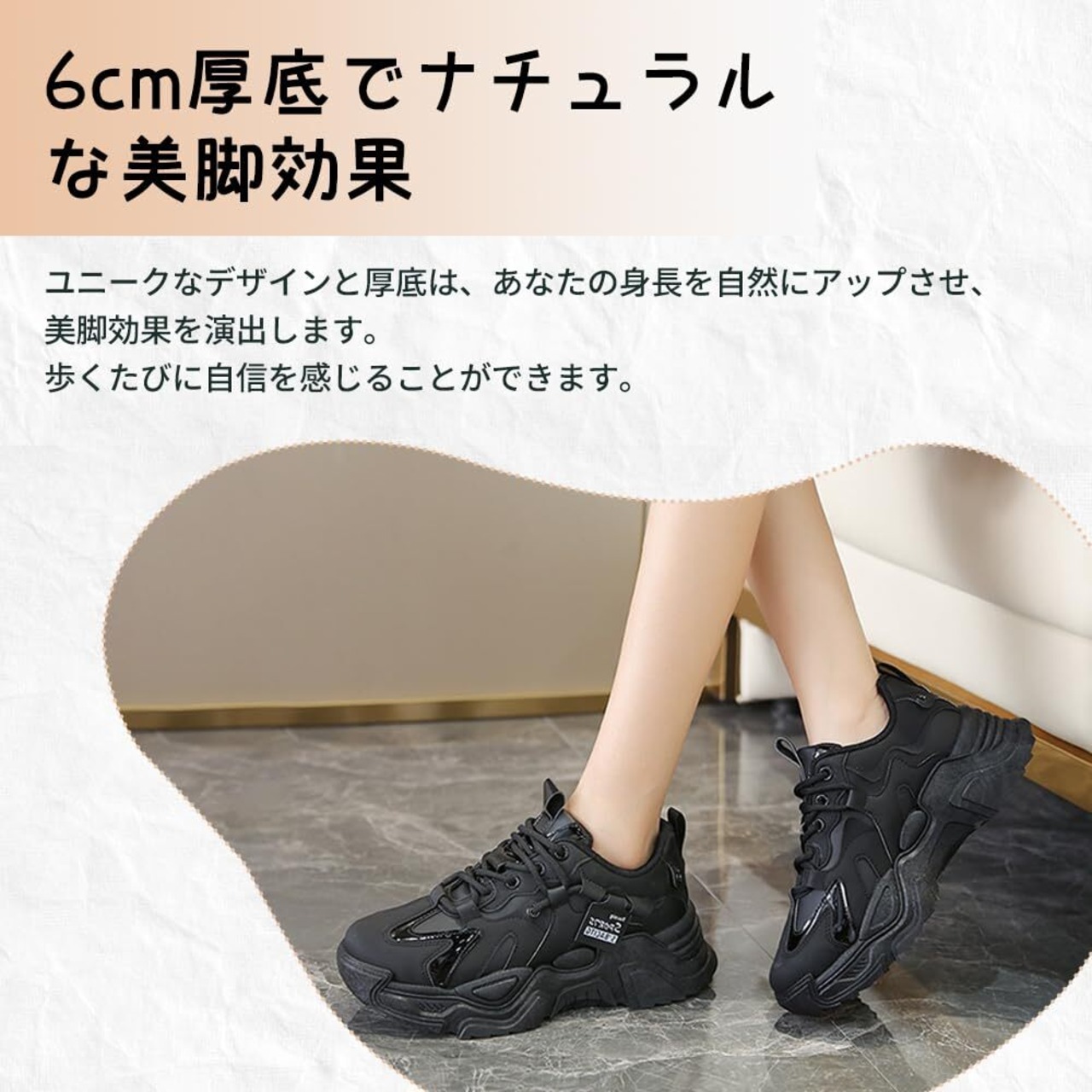 【美脚効果の実現】6cmの厚底デザインで、驚くほどの身長アップ効果をもたらします。履くことで瞬時に身長がアップし、同時に脚のラインをより長く見せることで、美脚効果を演出します。