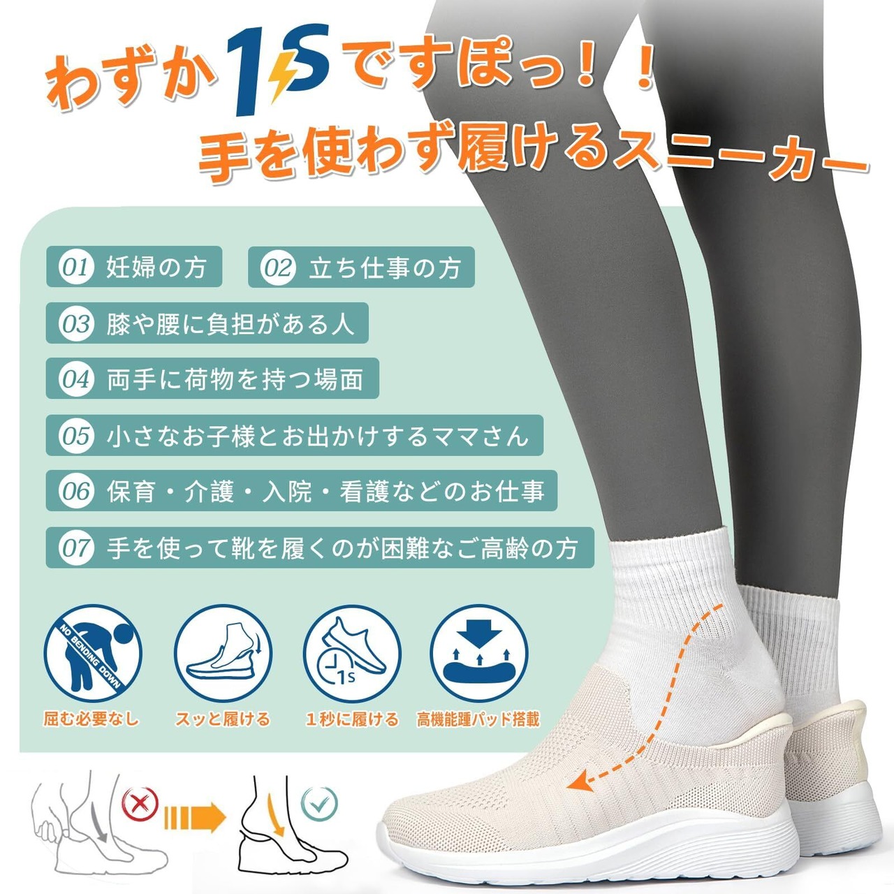 【立ったまま簡単に履けるデザイン】忙しい朝でも、靴べらなしで立ったままで簡単に履けるデザイン。靴紐やバンドの調整も不要で、準備時間を大幅に短縮できます。家事や育児に忙しい方や、通勤を急ぐビジネスマンに最適。朝の時間を有効に使える、便利でスムーズな履き心地を提供します。