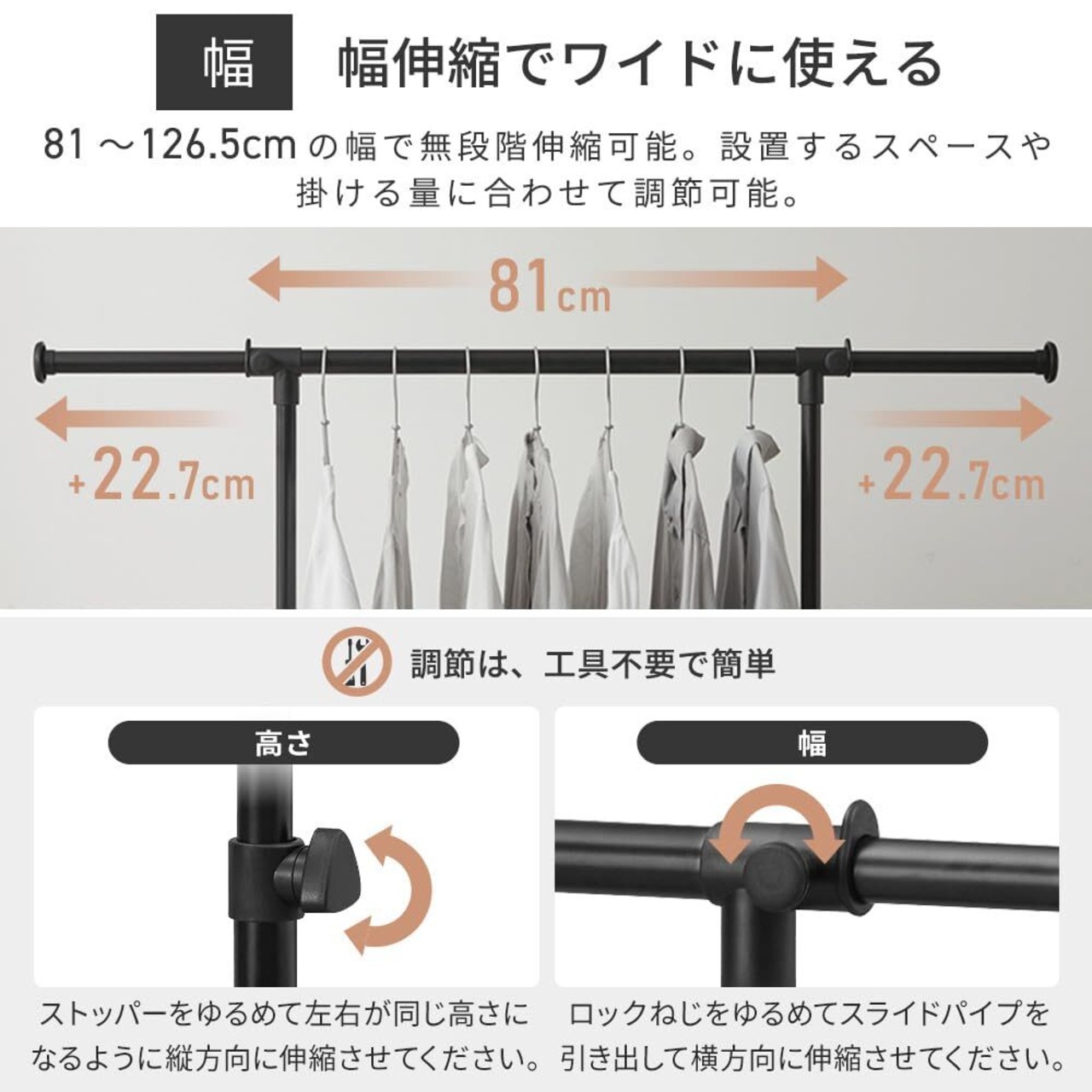 幅伸縮でワイドに使える。幅は81~126.5cmで調節可能。スペースに合わせてどこでも設置。