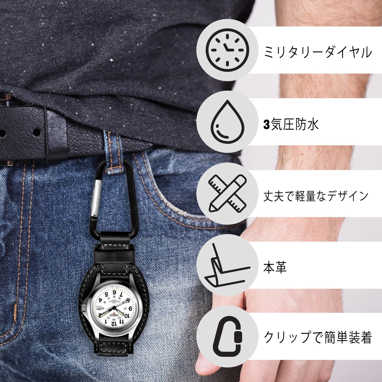 【カラビナウォッチ】高級レザーを使用したカラビナウオッチ。3気圧防水、見やすい文字盤、暗い場所でも確認しやすい夜光針を備え、普段使いからアウトドアまで幅広く活躍します。