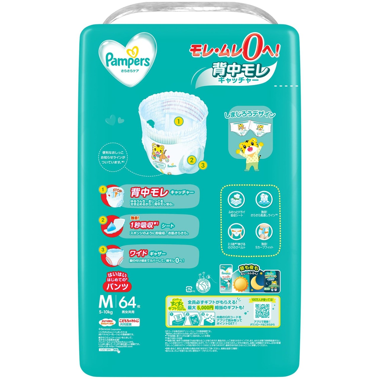 【パンツ Mはいはいサイズ】パンパース オムツ さらさらケア (5~10kg) 64枚 キャッチャー ゆるうんち・おしっこをせき止めるから、背中モレ安心。