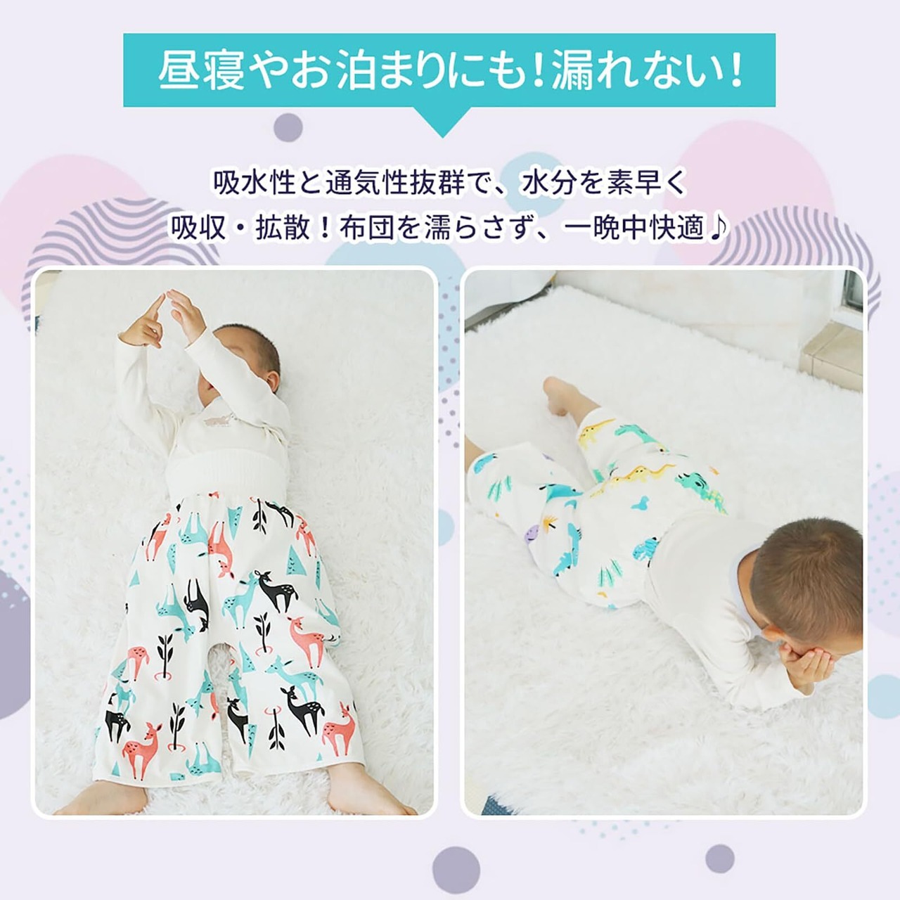 トイレトレーニング中のおねしょに対応し、柔らかい綿素材で快適な着心地を提供します。