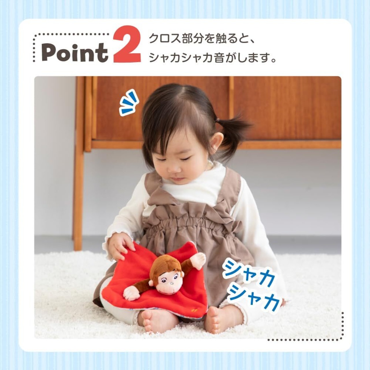 ●クロスは両面で手触りの違うフワフワ生地に、シャカシャカ音の仕掛けつき
