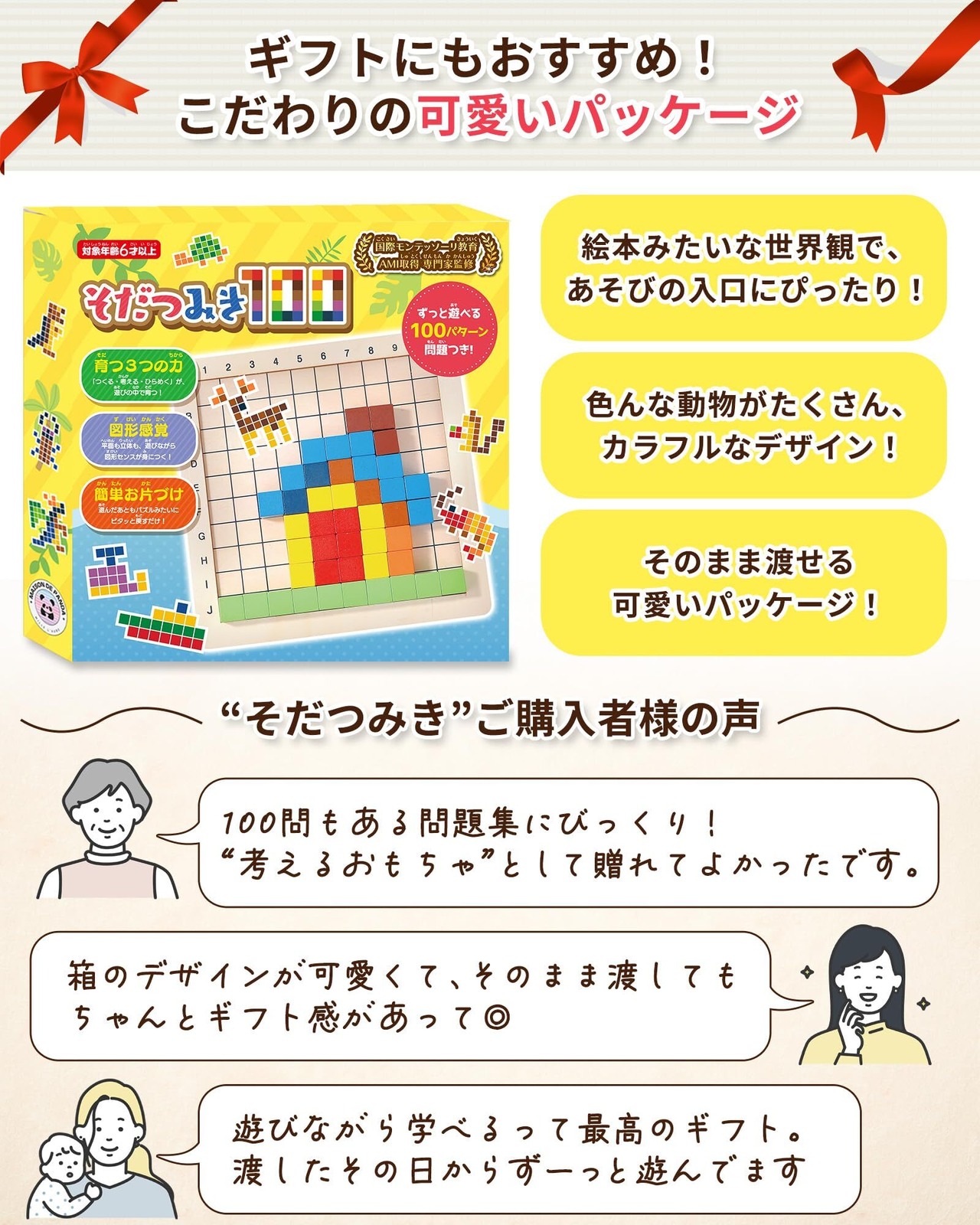 「どうせなら、遊びながら“学び”にもつながるおもちゃを選びたい」「知育にも、収納にもこだわりたい」そんな声に応えるのが、モンテッソーリ教育に基づいて設計された知育玩具『そだつみき』。木のキューブ型積み木100個+図形問題集つきで、3歳のお子様から、考える力がどんどん伸びてくる小学校低学年の子どもまで、幅広い年齢層で長く楽しめるようになっています。付属の木製の枠で片づけやすいので、おもちゃ収納の悩みも解消。ギフトにもぴったりです。