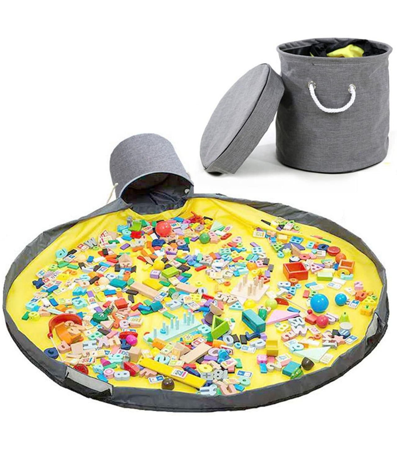 片付け簡単:シートのようになっている収納袋です。この上で遊べて、遊び終わったあと紐をキュッと絞めるだけでお片付け完了!おもちゃ箱よりとても簡単です。特におもちゃブロック等の細かいパーツのおもちゃの片付けが快適に。ご注意:当商品は折りたたんだ状態で梱包し発送するので、初めて使用する時、折りしわがありますが、直立して使用すると折りしわが自然に伸びます。