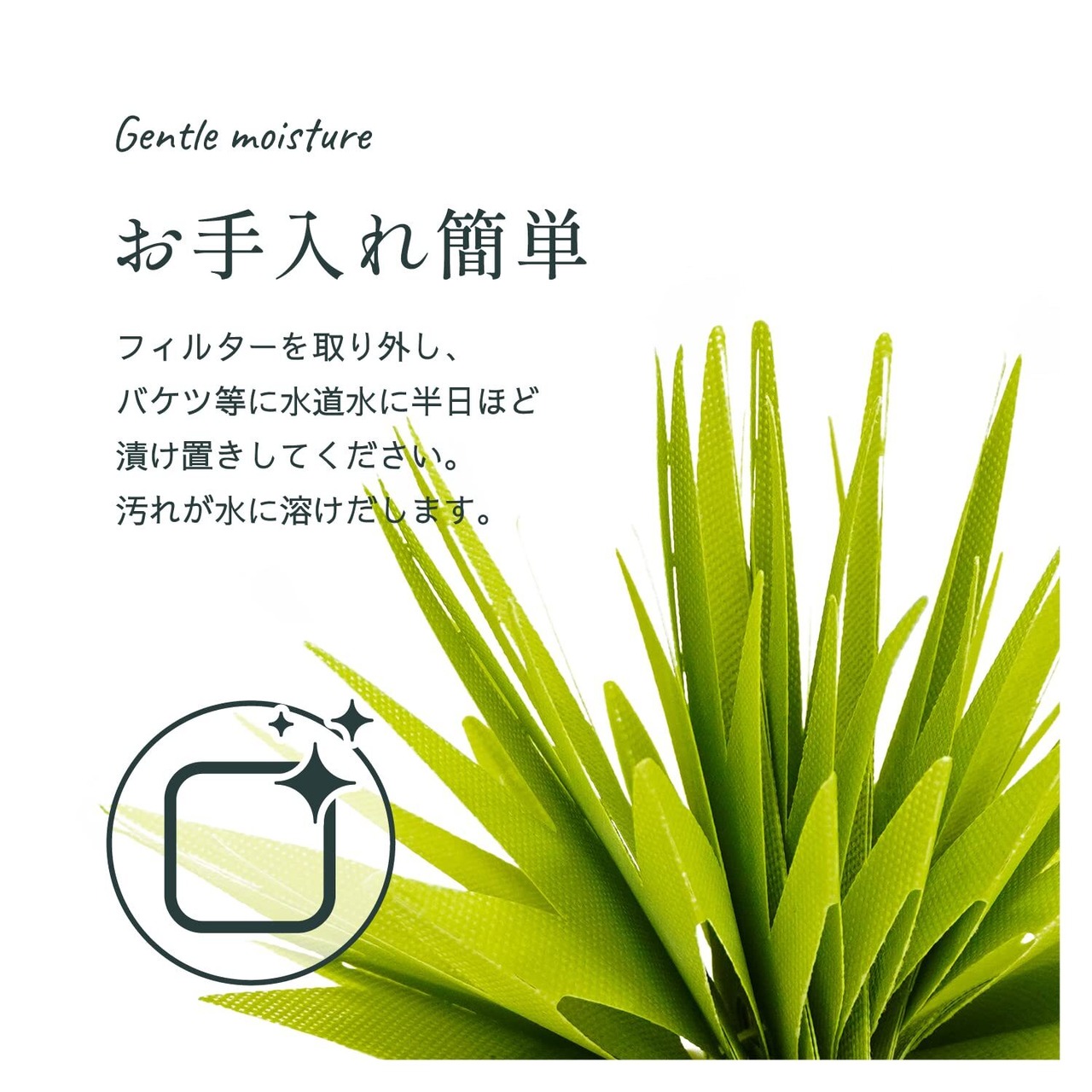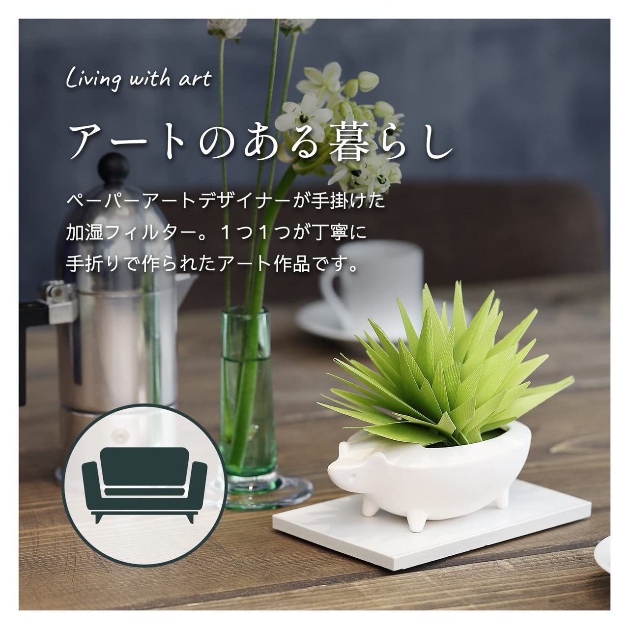 素焼きの陶器と、ポリエステルフィルターによるダブル加湿器です。使い方は簡単で水を注ぐだけで、素焼きとフィルターでお部屋に潤いをもたらします。フィルターは抗菌・防カビ効果があるものを、陶器は瀬戸物を採用しております。陶器はシーズンオフでもお部屋のインテリアにマッチする動物デザインとなっています。加湿量(=自然蒸発量)はコップ1杯の自然蒸発量の10倍以上。※室温20度湿度30%の条件下にてコップ1杯(径52mm)との比較。